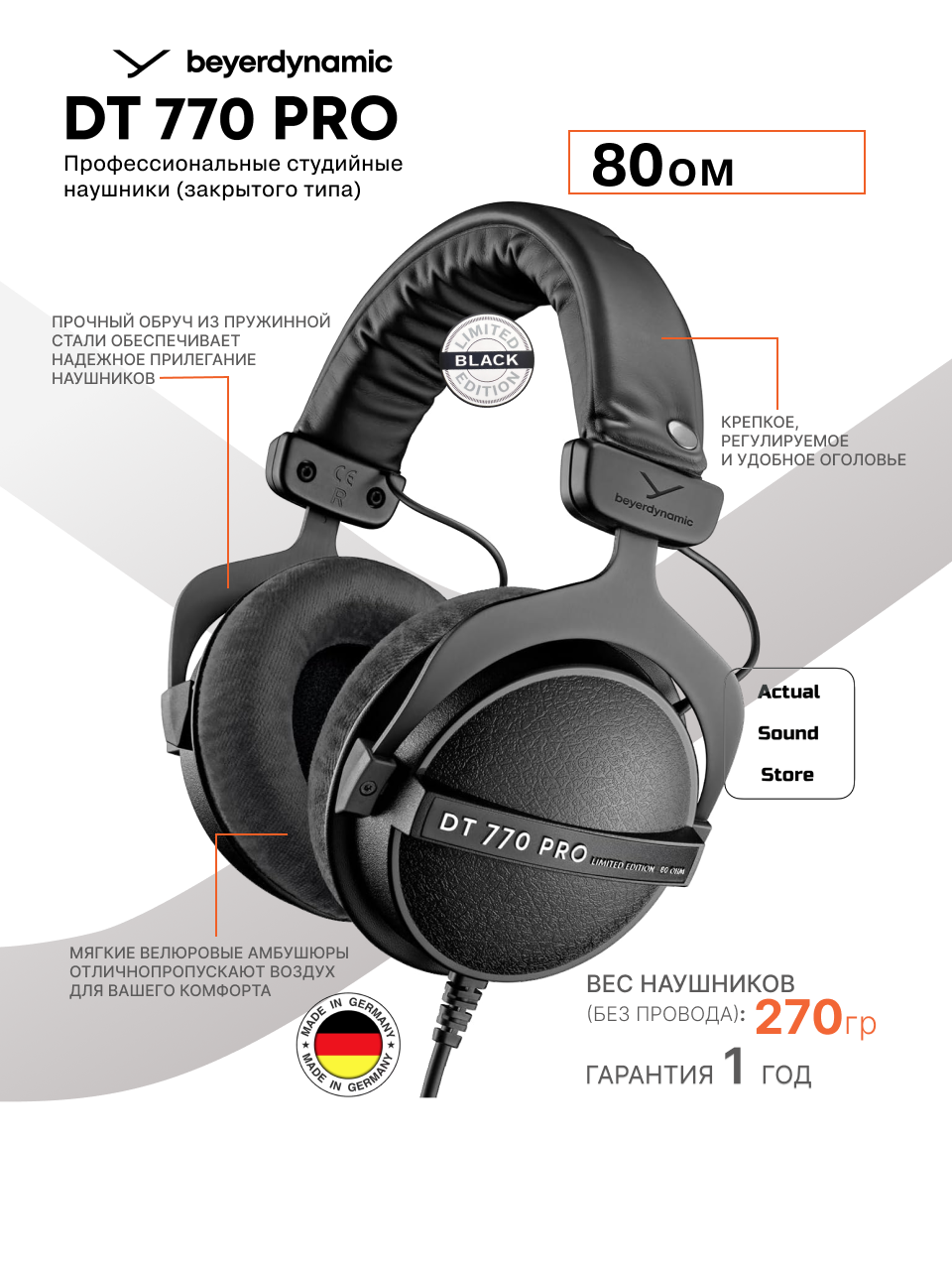 | Комплектация | Beyerdynamic DT 770 Pro Limited Edition 250 Ohm, переходник джек 3.5 мм — джек 6.3 мм, чехол для переноски, документация |