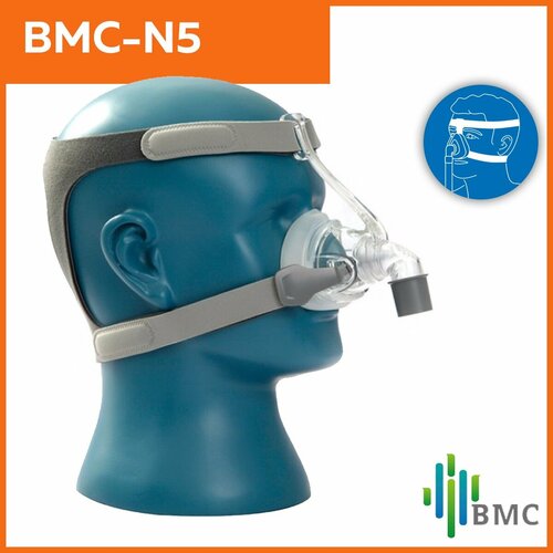 Назальные (носовые) СиПАП-маски закрывают область оса, и рекомендуются людям с правильной носовой перегородкой без искревлений. Такие маски имеют небольшую площадь контакта с лицом, поэтому комфортны в использовании. Назальная маска BMC N5 подходит для всех СиПАП и БиПАП-аппаратов со стандартным креплением диаметром 22мм и используется взрослыми пациентами с массой тела более 30 кг. Специальные выходные отверстия снижают шумность работы и расположены таким образом, чтобы выходящий воздух не тревожил партнера. Силиконовый уплотнитель гарантирует плотность прилегания маски и минимизирует утечки воздуха из-под маски. Специальный клапан, встроенный в угловой коннектор, обеспечивает безопасность дыхания пациента и защиту от удушья в случае экстренного отключения лечебного аппарата или блокировки воздушного потока. Специальные фиксаторы-липучки на ремнях крепления позволяют надежно закрепить назальную маску BMC N5 на голове. Настроив ремни крепления один раз, последующие снятия маски осуществляются с помощью специальных клипс (защелок) на передней части маски. Угловой коннектор, к которому присоединяется дыхательная трубка, свободно вращается на 360. Это позволяет избежать скручивания трубки во время сна.