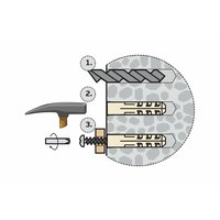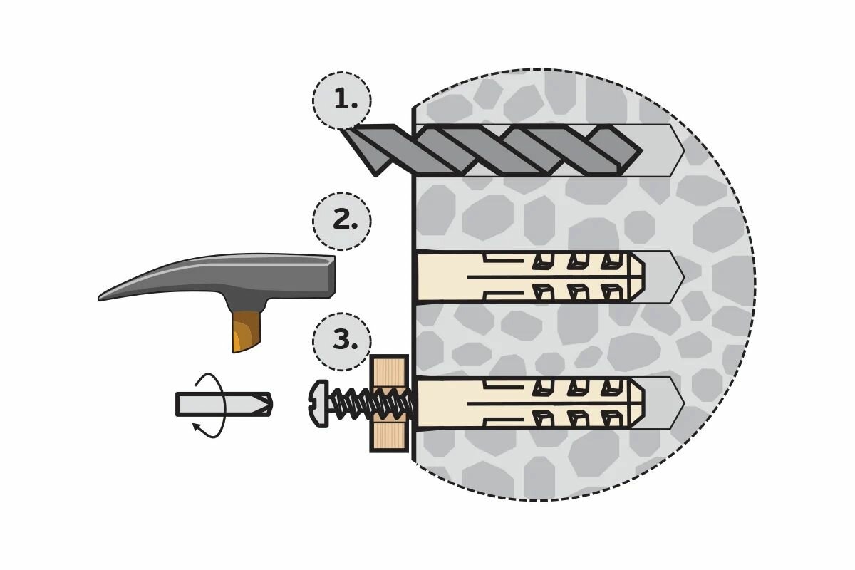 минимальная длина шурупа - длина дюбеля + толщина прикрепляемого материала; нагрузка на вырыв: бетон - 40кг, кирпич - 40кг; для монтажа: просверлите отверстие в соответствии с диаметром сверла и минимальной глубиной сверления, прочистите отверстие, установите дюбель в отверстие, закрутите шуруп