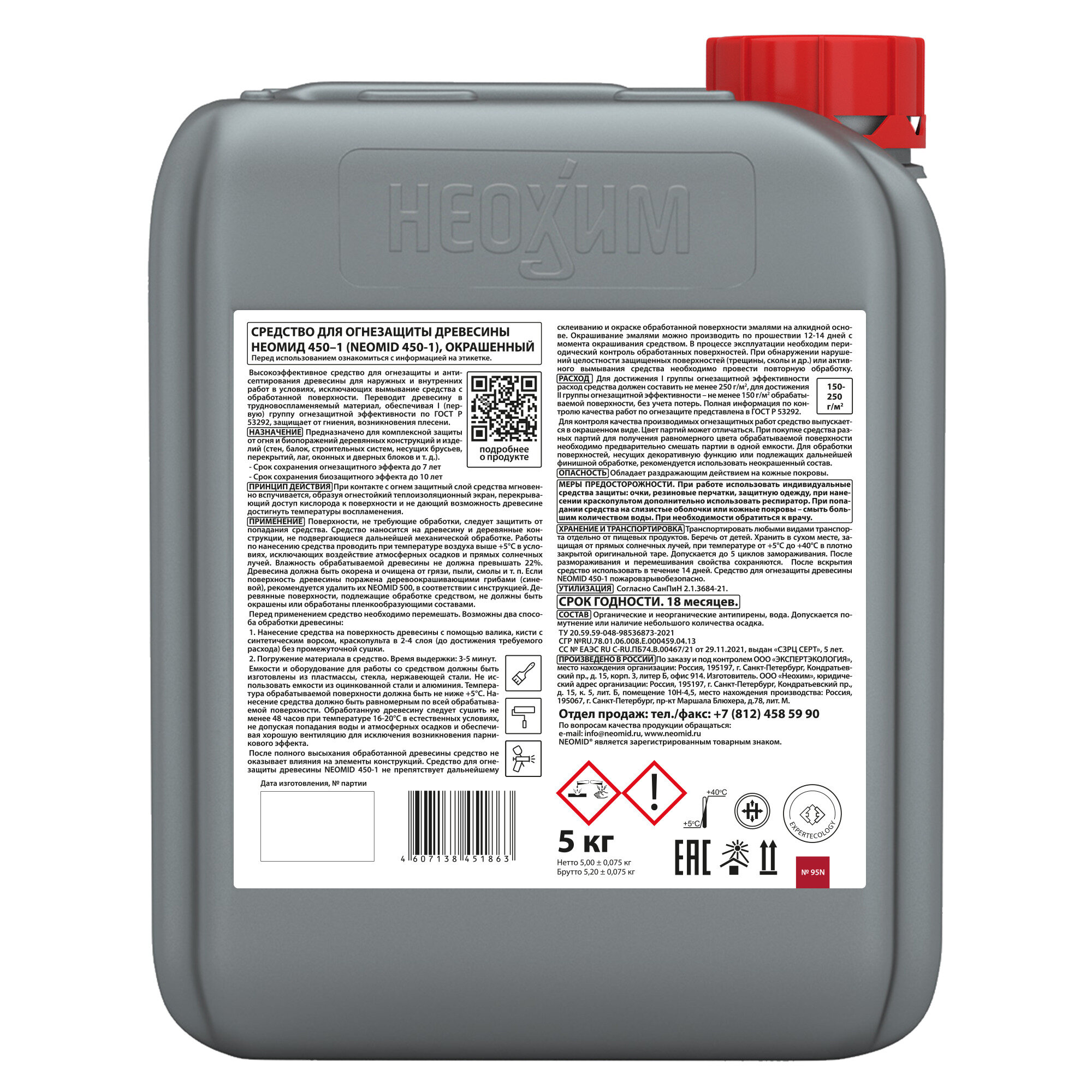 время высыхания не менее 48 ч. при t 16-20°C, относительной влажности 60%; срок защиты: огнезащита – до 7 лет, биозащита - до 10 лет; температура хранения: от +5°C до +40°C, допускается 5 циклов замораживания-размораживания; после вскрытия продукт использовать в течение 14 дней