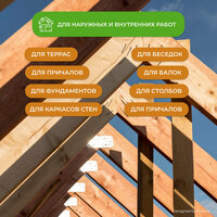 - Применяется для обработки причалов, террас, беседок, фундаментов, черных полов, каркасов стен, балок, перекладин, стропил, столбов и других деревянных изделий и конструкций.