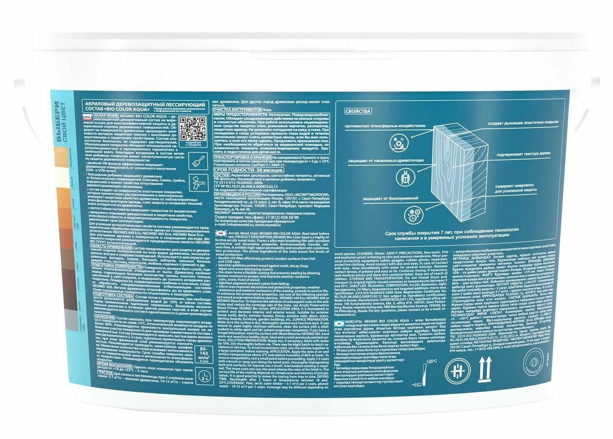 NEOMID Bio Color Aqua — деревозащитный декоративный состав на акриловой основе для высокоэффективной защиты и декоративной отделки деревянных поверхностей. Образует на поверхности древесины «дышащую» шелковисто-матовую защитную пленку с высокими декоративными и защитными свойствами. Состав экологически безопасен, не содержит растворителей. Образующееся покрытие обладает оптимальной паропроницаемостью и одновременно герметично к капельной влаге. Благодаря входящим в состав активным добавкам покрытие имеет пятиступенчатую систему защиты деревянной поверхности: