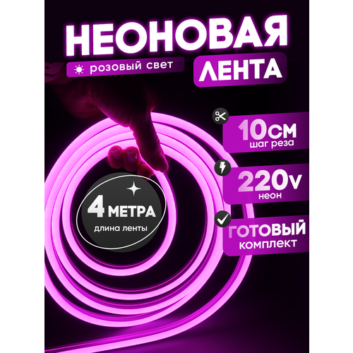 Гибкий неон это герметичная светодиодная лента в полимерной оболочке длиной 4 метра. Неоновая лента 220в цвет свечения розовый, сечение 8х16мм с кратностью реза 10см, что позволяет подогнать неон под нужный размер. Светодиоды нового поколения SMD2835 в количестве 120 штук в каждом метре, яркие, не нагреваются даже при длительной работе, позволяют значительно экономить электроэнергию мощность 10Вт/м. Материал оболочки силикон с добавлением ПВХ, не выгорает и не желтеет, более мягкий и гибкий. Светодиодная гибкая лента водонепроницаема IP67, можно погружать в воду на короткое время.