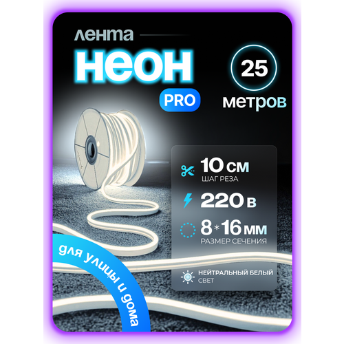Неоновая светодиодная лента, PJNeon, 25 м, 8×16 мм, 220В, IP67, гибкий неон, кратность реза 10см, нейтральный белый: сравнение цен, характеристики, фото, актуальное наличие и цены.