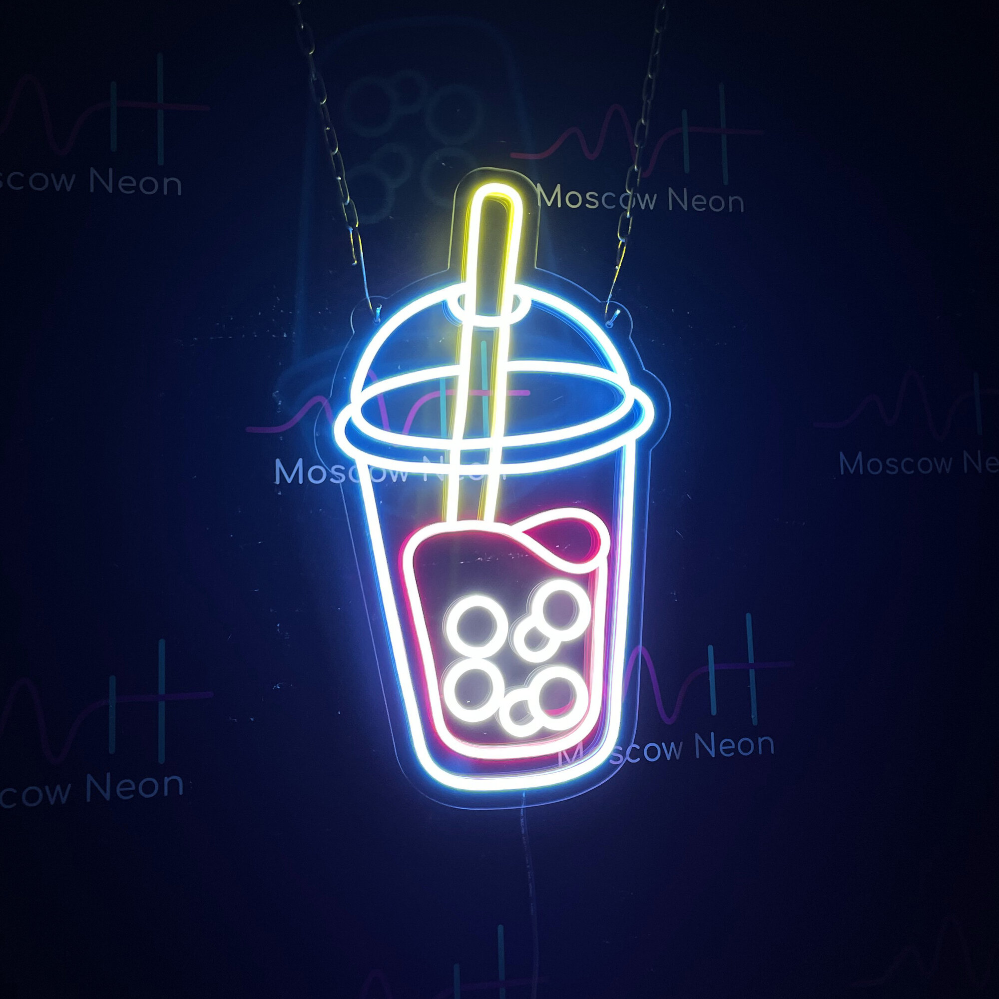 "Bubble tea" - это популярная тема для магазинов и кафе, специализирующихся на этом вкусном и оригинальном напитке. Неоновая вывеска с надписью "Бабл Чай" создает яркую и привлекательную атмосферу, привлекая посетителей, которые хотят насладиться этим уникальным напитком. Дизайн вывески может включать яркие цвета и изображения, связанные с бабл чаем, такие как пузырьки и перлы тапиоки.