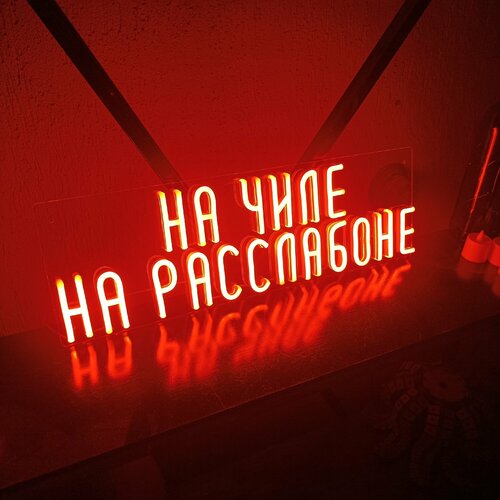 Неоновая табличка ручной работы на прозрачной подложке На чиле на раслабоне, 50x16 см. Изготовлена из гибкого небьющегося светодиодного неона. Силиконовая оболочка неона устойчива к механическим повреждениям. Подложка из прозрачного акрила толщиной 3 мм. Мы используем литой акрил, поэтому наши изделия прочные и их сложнее разбить. На прозрачной подложке предусмотрены отверстия для крепления к стене.