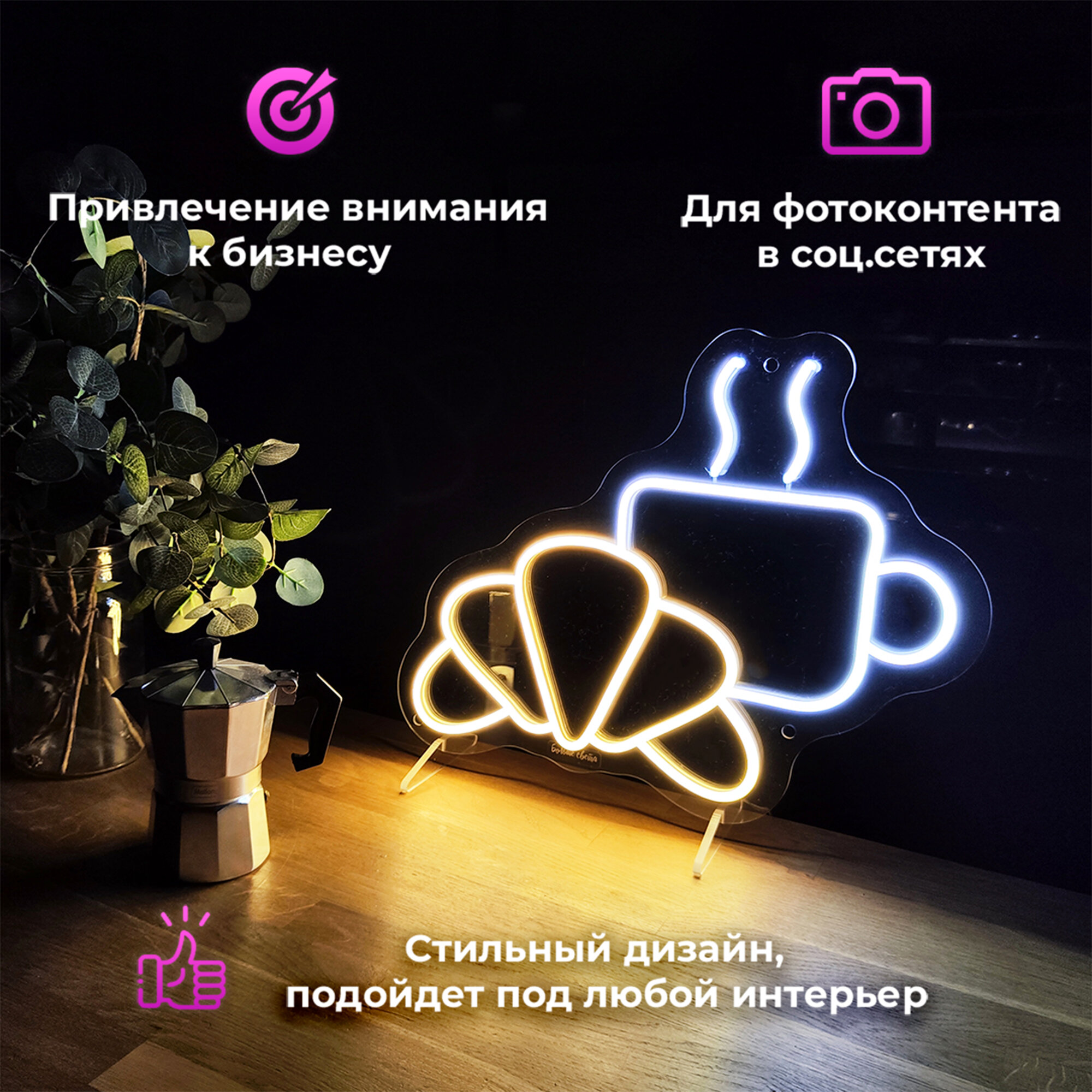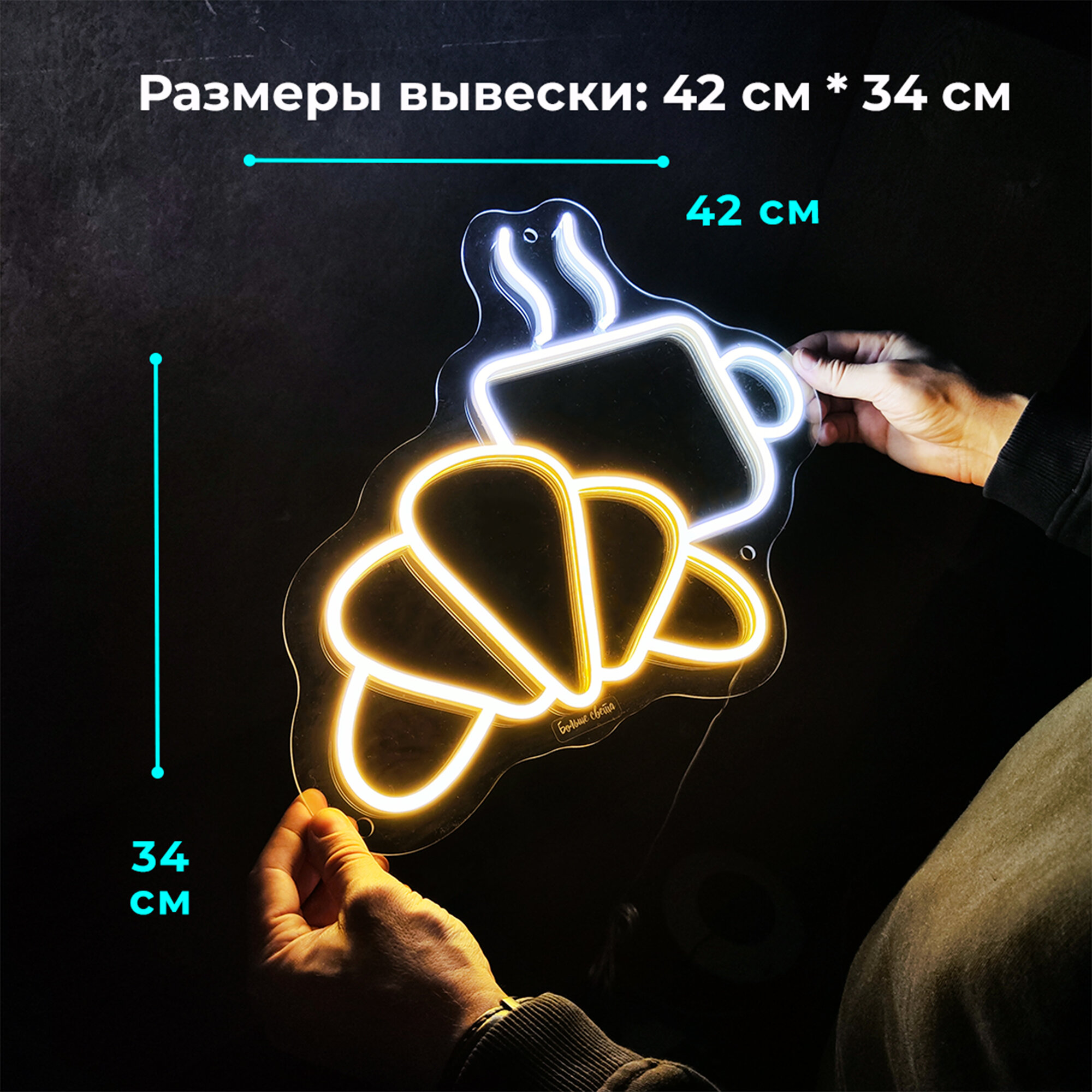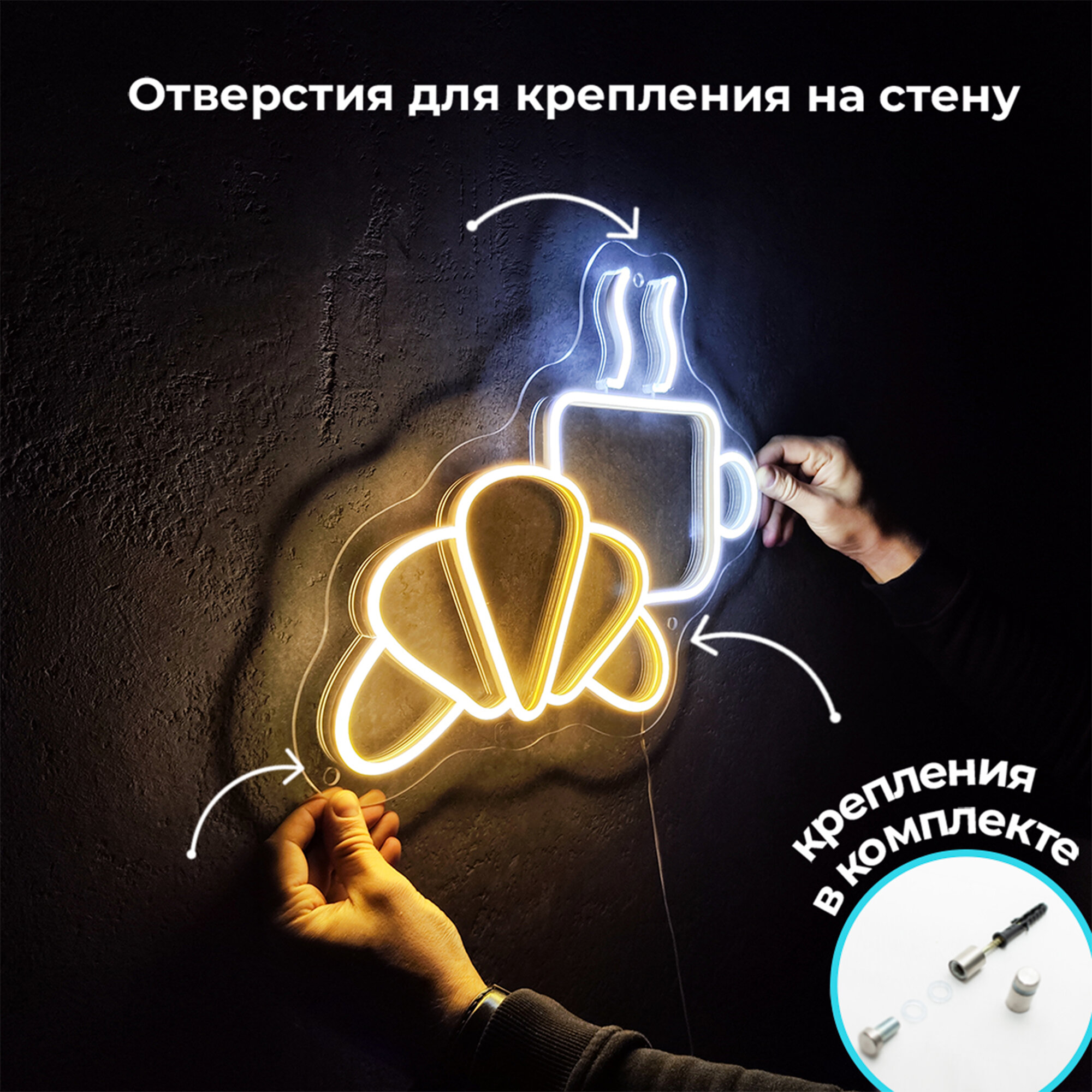 Неоновая вывеска "Кофе & круассан" - это не просто источник света, это стильный и оригинальный элемент декора, который добавит уюта и тепла в ваш интерьер.