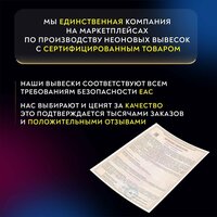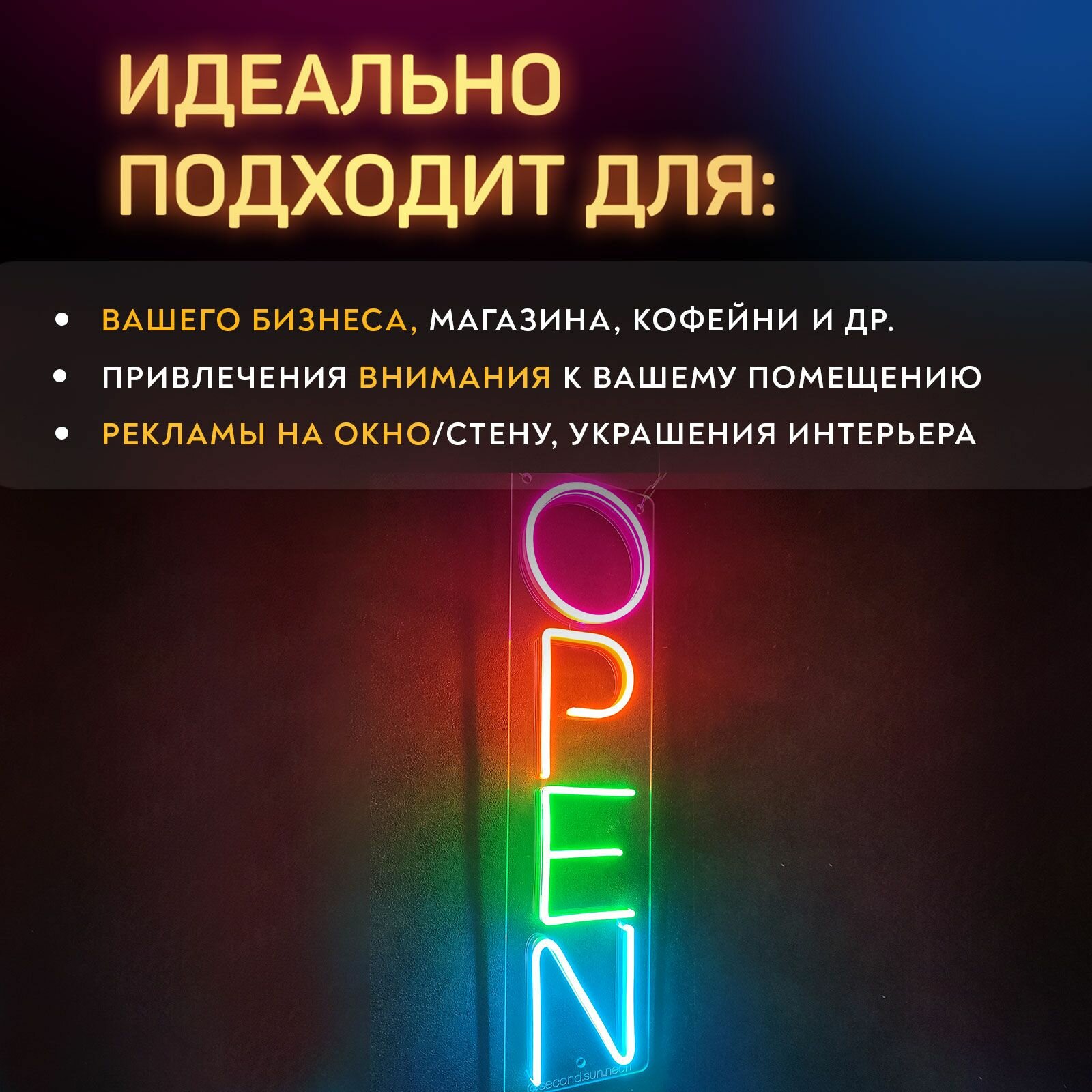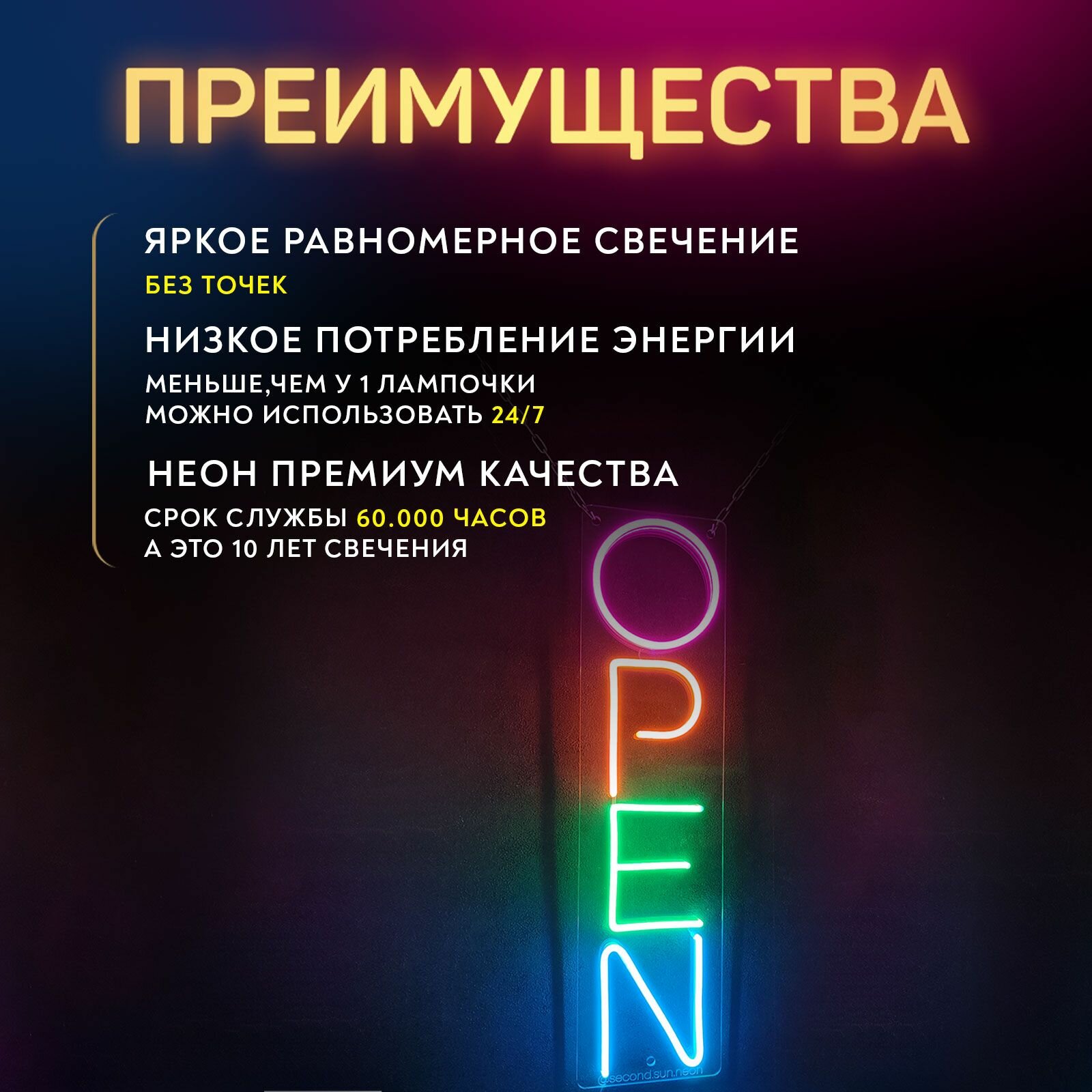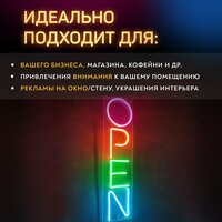 Озарите свой бизнес яркими красками с помощью неоновой вывески OPEN. Неоновая реклама на окно - это эффективный способ привлечь внимание проходящих мимо людей и сделать ваш бизнес выделяющимся среди множества конкурентов. Разноцветная и яркая неоновая вывеска привлекает внимание. Неоновая вывеска Открыто на стену - это не только красивый дизайн, но и эффективный способ привлечения клиентов. Благодаря неоновым рисункам и светильникам, вы сможете создать уникальный образ вашего магазина, ресторана или закусочной. Неоновая реклама на окно идеально подойдет для сферы общепита, давая всем понять, что вы готовите вкусно. Современная неоновая вывеска в трендовом дизайне делает ваш бизнес более ярким и привлекательным для клиентов.Неоновый светильник подоходит не только для ресторанов, но и для магазинов, баров, кафе и других заведений, например, салонов красоты и аптек. Неоновый свет привлекает внимание и создает уютную и запоминающуюся атмосферу.Неоновая вывеска для бизнеса - это современный способ рекламы на окно или стену, который помогает вам выделяться среди конкурентов, привлекать больше новых клиентов и увеличивать ваши продажи.Мы позаботились о том, чтобы вывеска пришла к вам в идеальном состоянии благодаря крепкой упаковке, исключающей любые повреждения во время доставки.Неоновый рисунок на окно для ресторана сделан из проверенных и качественных материалов, устойчивых к нагреву и полностью безопасных для ваших клиентов и персонала. Неоновая табличка работает от 12В, потребляет электроэнергии как 1 лампочка, что экономит ваш бюджет. Вывеска может работать 24/7 или течение 60000 часов, и имеет срок службы примерно 10 лет.Неоновая реклама для окно легко крепится и не требует специальных навыков для установки. В комплект входят все нужные элементы для монтажа, чтобы неоновую табличку можно было легко повесить на окно или стену самостоятельно, не прибегая к помощи профессионалов.Информация о продукте, а также уход и безопасность использования тщательно изложены во флаере, который кладём в комплект, что поможет обеспечить долговечность и надежность вашей неоновой вывески. Использовать неоновые вывески можно только в помещении.