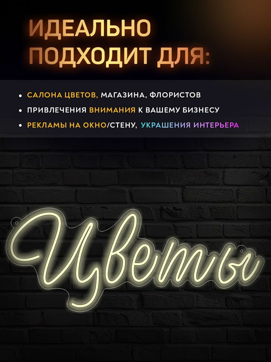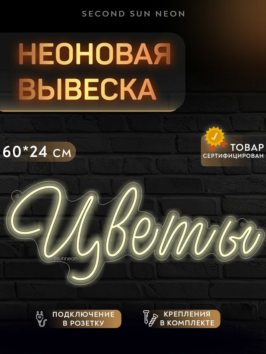 Неоновая вывеска “Цветы” для окна легко крепится и не требует специальных навыков для установки. В комплект входят все необходимые элементы, чтобы неоновую табличку можно было повесить на окно или стену самостоятельно, без помощи специалистов.