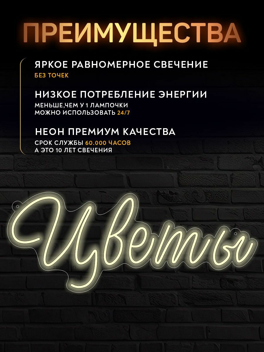 Наша неоновая вывеска на окно для магазина цветов сделана из качественных, устойчивых к нагреву материалов и полностью безопасна для клиентов и персонала. Неоновая табличка работает от 12В, потребляет минимум электроэнергии, что делает её экономичной. Вывеска может работать 24/7 и имеет срок службы до 10 лет.