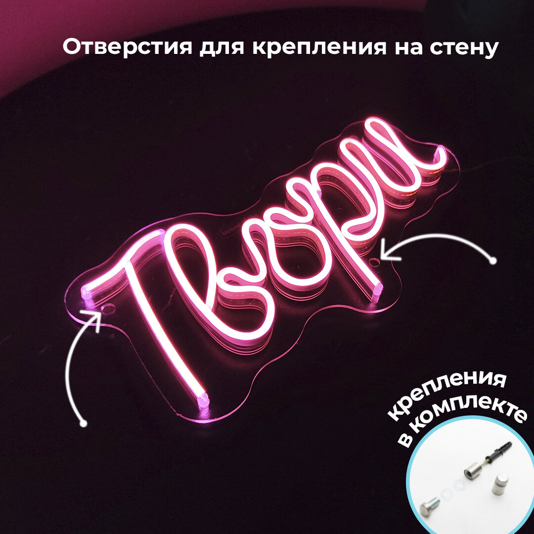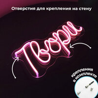 Производителем неоновой вывески "Твори" является российская компания, что гарантирует высокое качество и надежность товара. В комплект поставки входят диммер, блок питания 12V и подставка настольная.
