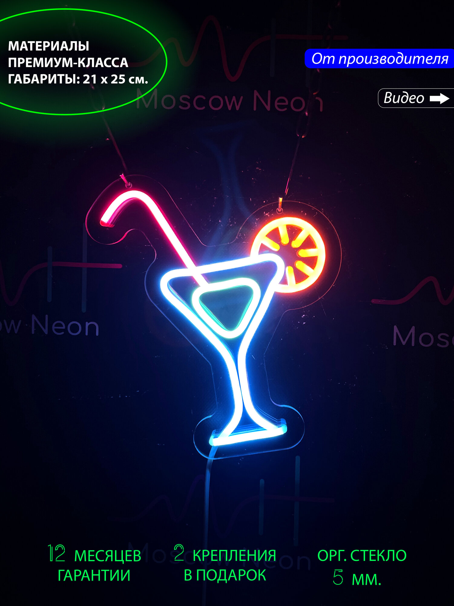 ✦ Материал: гибкий LED. Толщина неона: 6 мм. ✦ Подложка — прозрачный акрил (оргстекло) 5 мм. ✦ Блок питания с «вилкой» ✦ Длина сетевого кабеля — 1,5 метра ✦ Диммер для регулировки яркости и создания режимов мигания. ✦ Типы креплений: прозрачная леска и наноскотч ✦ Варианты установки: на стену / на стол ✦ Инструкция по эксплуатации ✦ Гарантийный талон