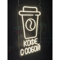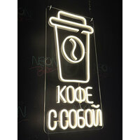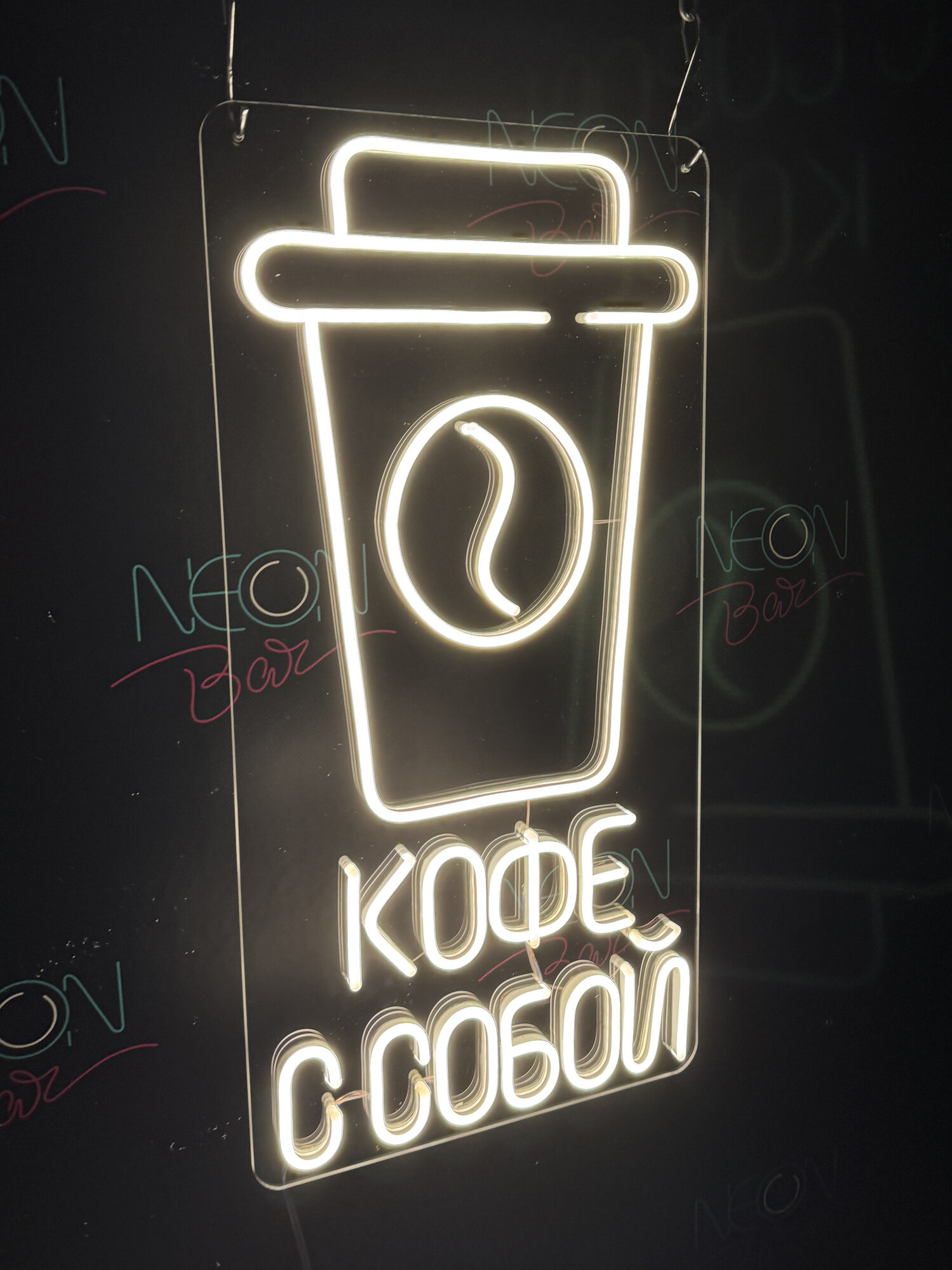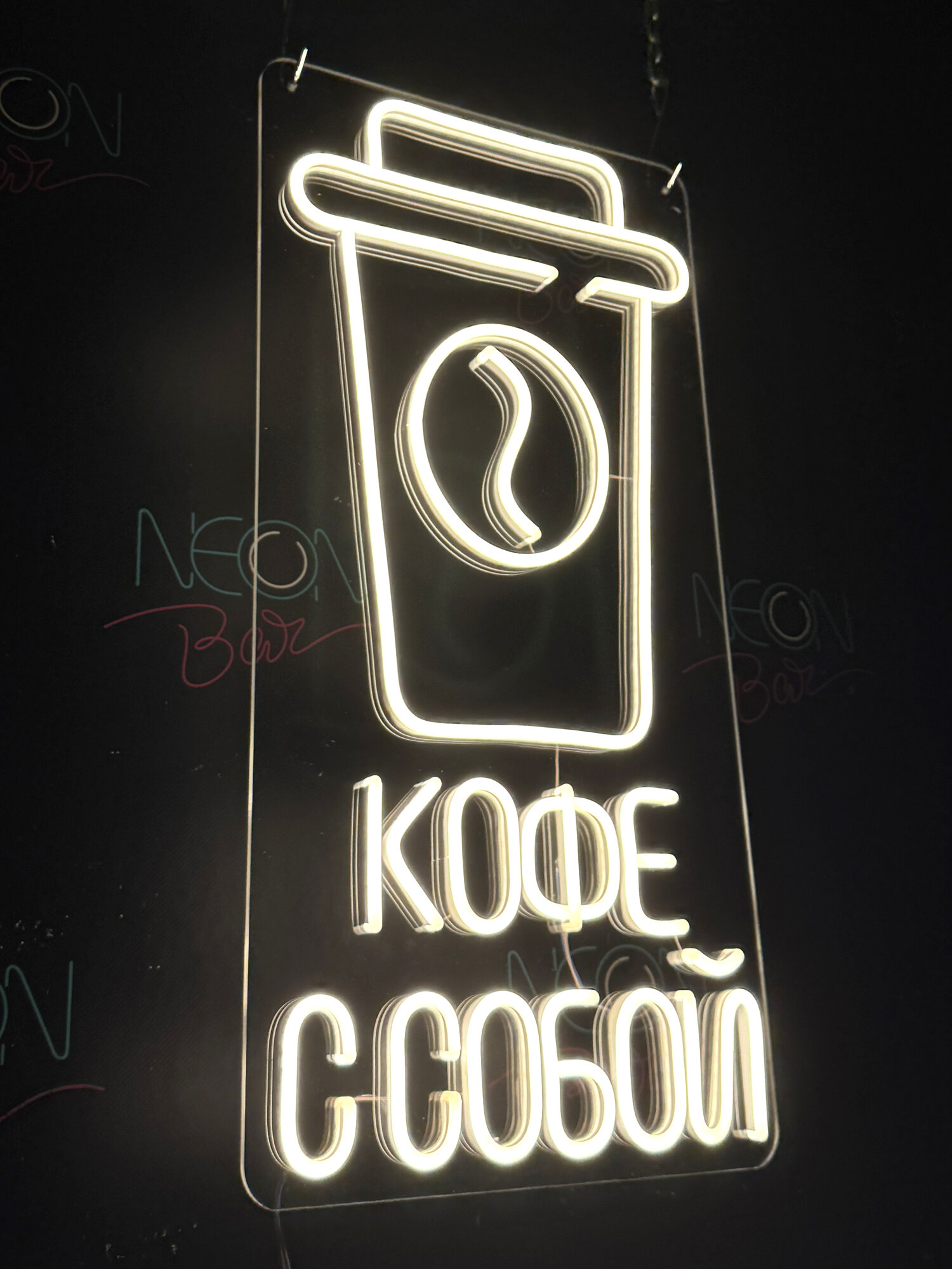 Неоновая вывеска «Кофе с собой» — яркое и стильное решение для вашего кафе или кофейни. Она отлично привлекает внимание прохожих как днём, так и ночью, создавая уютную и современную атмосферу. Такая вывеска станет эффектным акцентом фасада или интерьера, помогая выделиться среди конкурентов и увеличить поток клиентов.