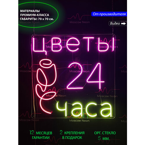 Неоновая вывеска с надписью «Цветы 24 часа» — яркий и заметный элемент для круглосуточных цветочных магазинов. Помогает привлечь внимание клиентов в любое время суток и подчёркивает доступность ваших услуг. Отлично смотрится на витрине и создаёт современный образ вашего бизнеса.