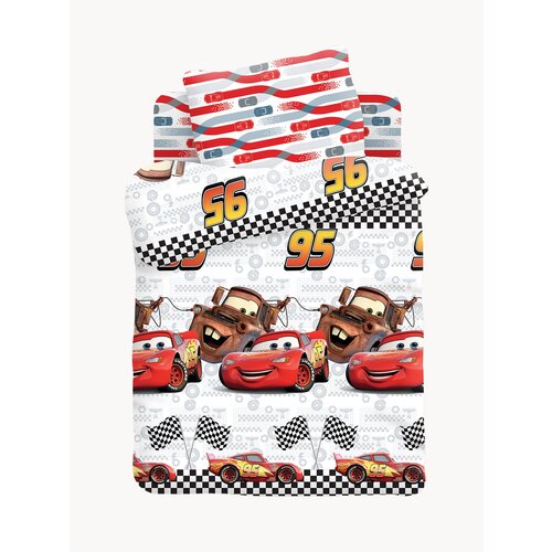 Легендарный Молния Маккуин не знает поражений: главная гоночная тачка из мультфильма Cars, а также его друг Мэтр смело встречают испытания на дороге. Любимые герои, изображенный на бело-сером пододеяльнике - отличный пример для подражания. Юные автолюбители оценят и другие машинки, c вихрем проносящиеся по серым наволочке и простыни.
