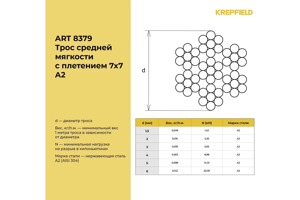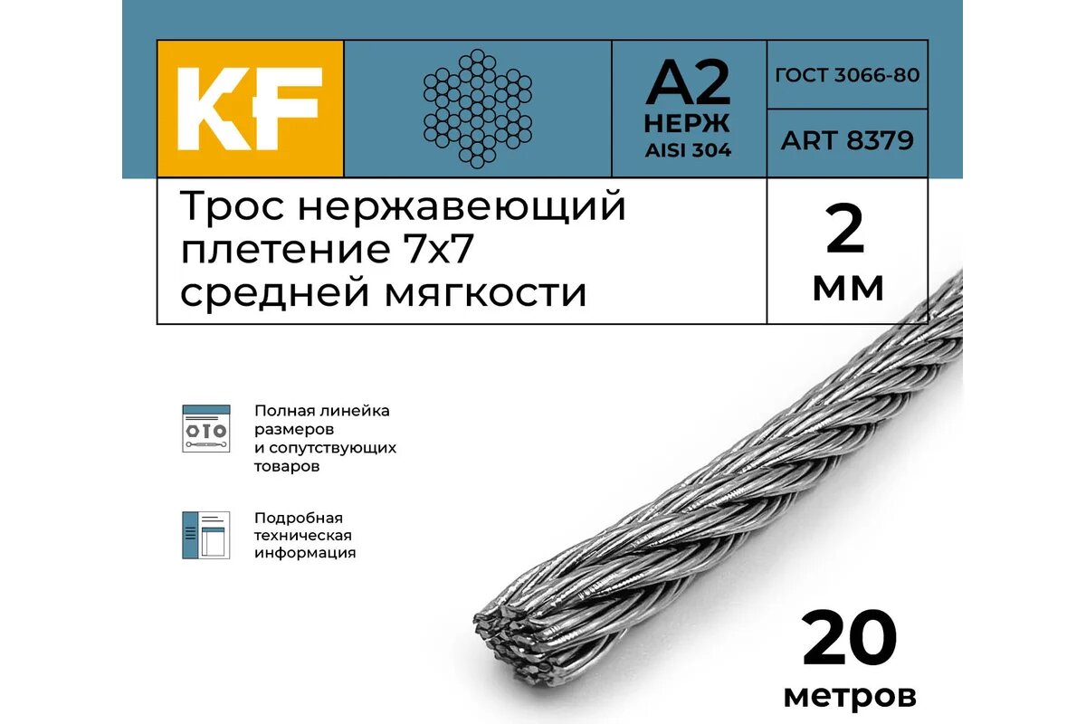 Нержавеющий трос KREPFIELD 2 мм, сталь А2, плетение 7×7, средней мягкости, 20 м 8379А2ТРОС2ММ-20: сравнение цен, характеристики, фото, актуальное наличие и цены.