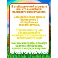 В этой карточной игре есть всё, что ты любишь: единороги и разрушения. Собирай свою армию единорогов с волшебными способностями, переманивай или заколдовывай единорогов соперников и захватывай мир! Бонусы и штрафы помогут сделать это коварно, весело и непредсказуемо!
