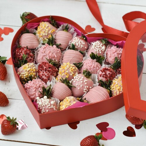 Купить New! Клубника в клубничном шоколаде, 18-25 шт с сублимированными манго и малиной, вкусный и красивый подарок с доставкой по всей России.