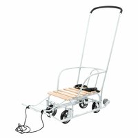 в разложенном виде (Д без ручки х Ш по спинке х В по спинке на полозьях/В по спинке на колесах): 86,5 х 38,5 х 41/47 см; высота санок по сиденье на полозьях/на колесах: 18/24 см; сиденье (ДхШ): 46 х 29 см; плоские полозья: 3 х 1,5 см; высота с ручкой на полозьях/на колесах: 94/100 см; в упаковке (ДхШхВ): 86 х 38 х 20 см; вес стального каркаса - 5,2 кг.