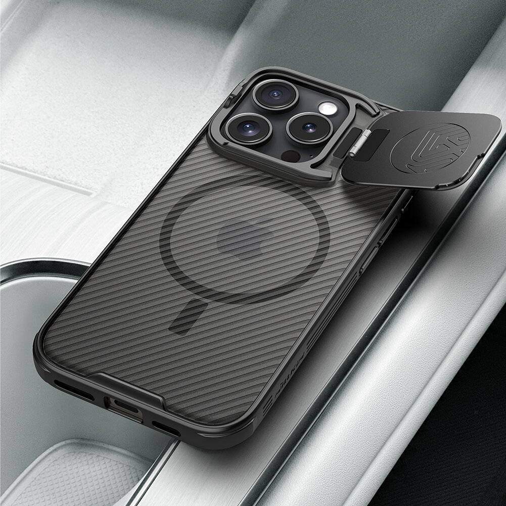 Купить Чехол прозрачный тонированный (Transparent Black) от Nillkin с металлической крышкой и MagSafe на iPhone 16 Pro, серия CamShield Prop Magnetic Case с доставкой по всей России.