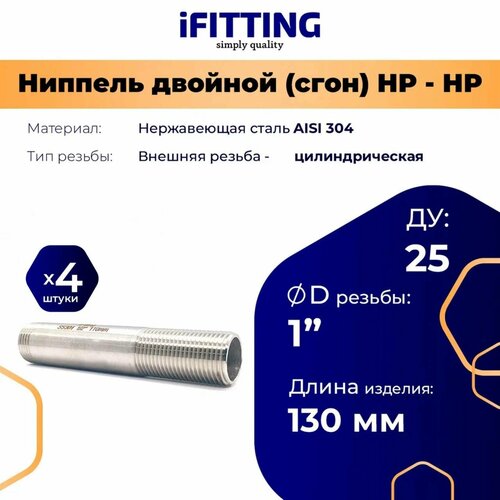 Ниппель 1 дюйм двойной (сгон 1) нержавеющий Ду 25 1" AISI 304 представляет собой часть трубы с определенным диаметром, тонкой наружной резьбой с двух сторон: с одной – длинная, с другой – короткая. Длина общая- 130 мм Длинная резьба- 50 мм Короткая резьба -11 мм Величина длинного резьбового отрезка доходит до 30 нитей. Данный параметр разрешает накрутить контргайку и нержавеющую муфту. Соединение при помощи сгонов труб (ниппель 25мм), одинаковых по диаметру, выполняется благодаря резьбе. В результате использования сгона участки трубопровода демонтируются без разбора всей системы, замена труб проводится на конкретных участках. Конструкция соединяет между собой две трубы или деталь с вентилем и фитингом. Элементы соединяются без прокрутки.