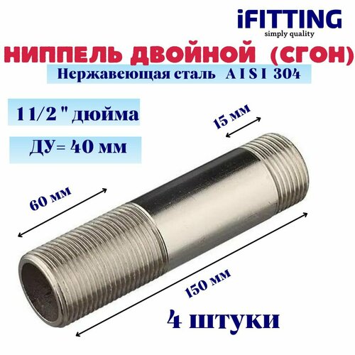 Ниппель 11/2 двойной (11/2 сгон) нержавеющий Ду 40 1 1/2" AISI 304 - это высококачественный фитинг для металлических труб, изготовленный из нержавеющей стали марки AISI 304. Этот материал характеризуется высокой прочностью и долговечностью, что обеспечивает надежность и долговечность соединения.