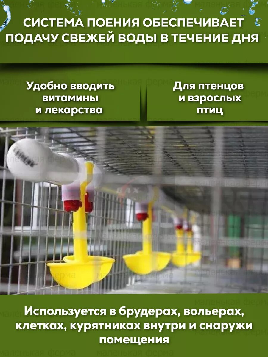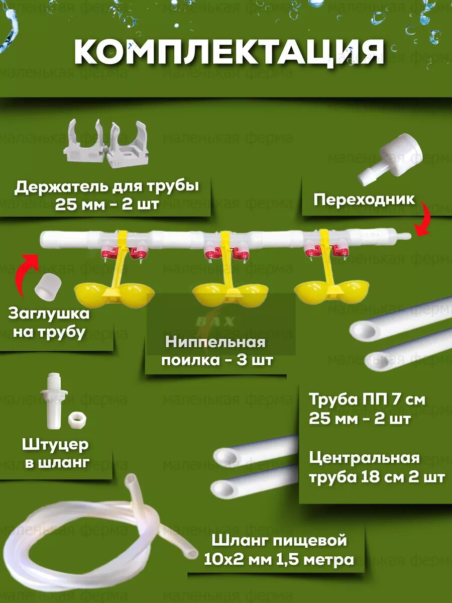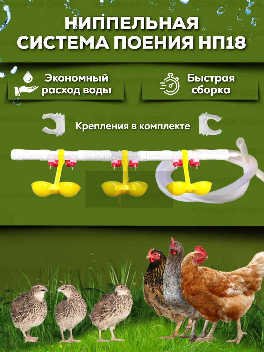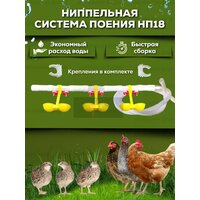 Ниппельная система поения НП18 комплект поилка в сборе. Готовая система ниппельного поения для кур, цыплят перепелов и другой птицы . Особенности: лёгкий монтаж и сборка, для любого вида птицы, всё уже собрано и готово к эксплуатации. Данная система универсальна, благодаря поилкам со срабатыванием ниппеля на 360 гр подходит для поения как цыплят, перепелов так и взрослой птицы. В поставке идёт съёмная заглушка, которая позволяет в будущем удлинять систему с помощью переходников. Система поставляется в разобранном виде.
