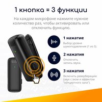 ✅ 3 уровня шумоподавления. В петличные микрофоны встроены интеллектуальные чипы DSP для активного подавления внешних шумов, которые позволяют записывать чистый звук даже в шумной среде. Одним коротким нажатием по кнопке питания на каждом микрофоне можно выбрать один из трех уровней шумоподавления.