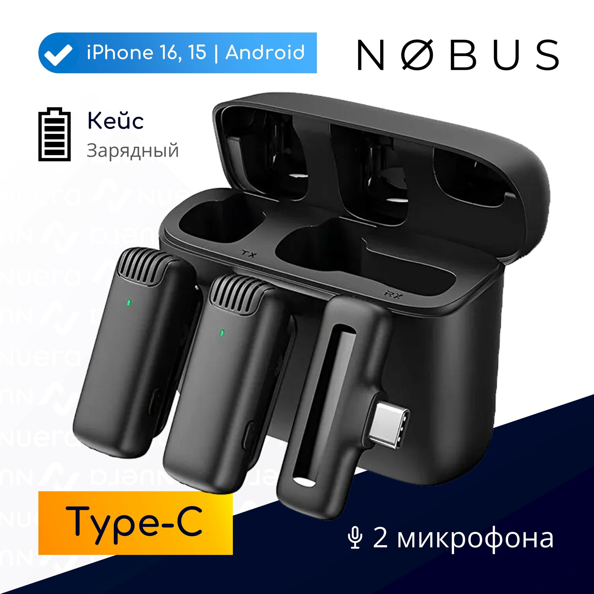 NOBUS J13-C - комплект из 2 стильных и практичных беспроводных микрофонов петличек с приемником Type-C и магнитным зарядным кейсом. Предназначены для устройств с разъемом USB-C: iPhone 16, 15 серии и новейших iPad, Android смартфонов и планшетов, ноутбуков, фото- и видеокамер.