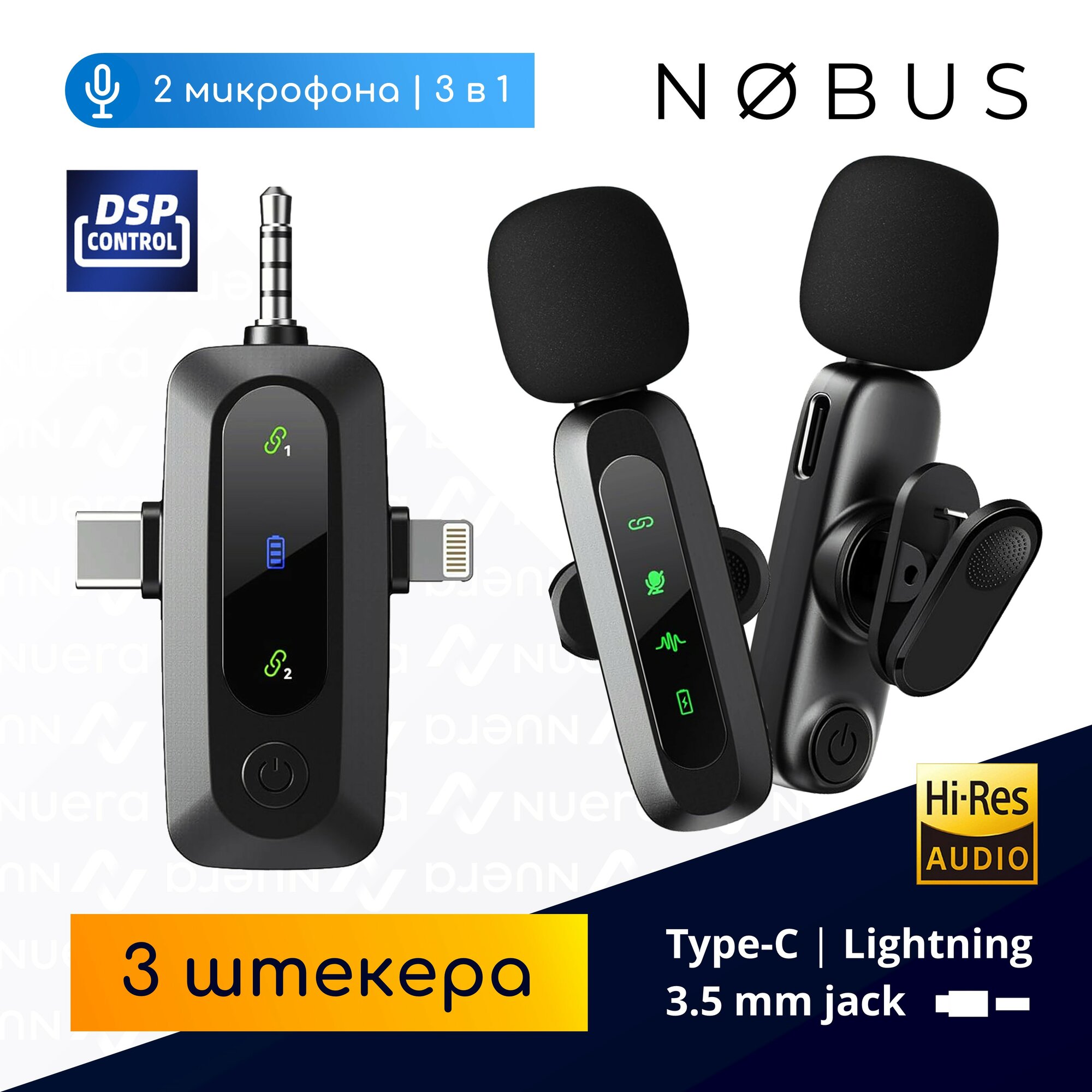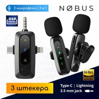 NOBUS J3-U duo - универсальный микрофонный комплект под разъемы Type-C, Lightning и 3.5 мм. Включает 2 беспроводных петличных микрофона и ресивер 3 в 1.
