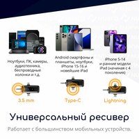 ️ Максимальная совместимость. В наборе вы найдете ресивер с 3 штекерами (3.5 mm jack, USB-C и Lightning). С его помощью вы сможете подключить микрофоны петлички к большинству мобильных телефонов (включая iPhone и Android), планшетов (включая iPad), ноутбуков (включая MacBook), ПК, фото- и видеокамер, а также аудиотехники (включая домашние аудиосистемы, беспроводные колонки, автомагнитолы, микшерные пульты и т. п.).