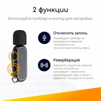 ✅ Беспроводной. Микрофон после включения за секунду синхронизируется с приемником по внутреннему каналу на частоте 2,4 ГГц. Не требует включения Bluetooth на устройстве. Дальность действия - до 20 метров при отсутствии видимых препятствий между микрофоном и приемником. Время работы от встроенного аккумулятора емкостью 120 мАч - до 10 часов. На микрофоне есть разъем Type-C, поэтому его можно заряжать не только от кейса, но и через кабель. Низкая задержка передачи - всего 9 мс (0,009 с).