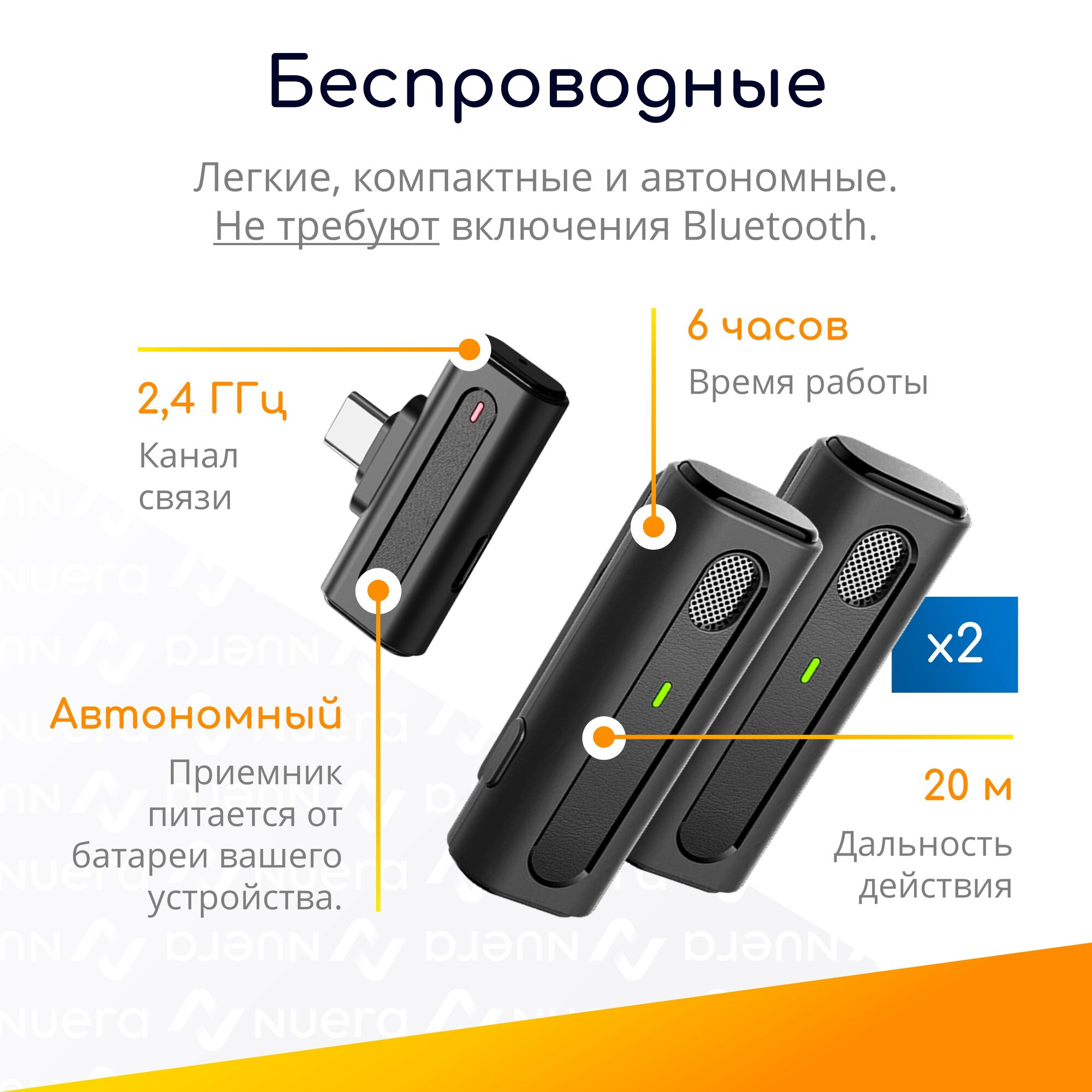 ✅ Беспроводные. Микрофоны после включения моментально синхронизируются с приемником по внутреннему каналу на частоте 2,4 ГГц. Не требуют включения Bluetooth на устройстве. Дальность действия - до 20 м при отсутствии видимых препятствий между микрофонами и приемником. Время работы от встроенного аккумулятора емкостью 65 мАч - до 6 часов. На микрофонах есть зарядный разъем Type-C.