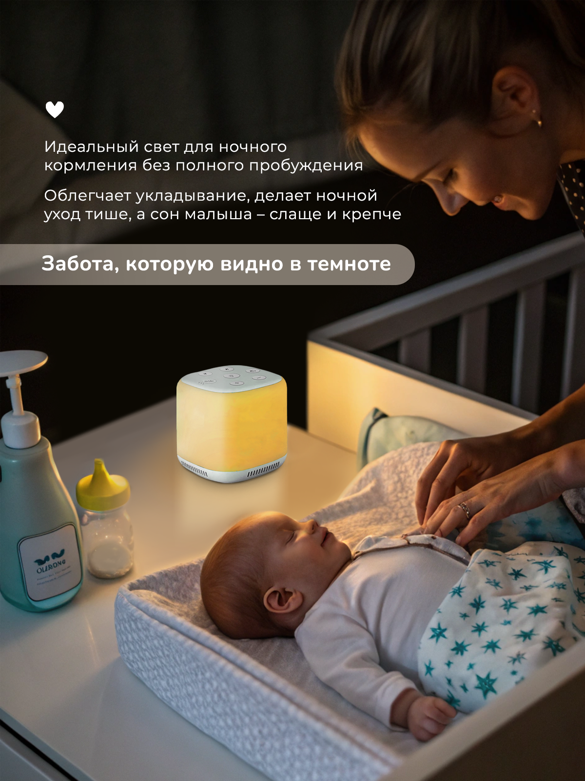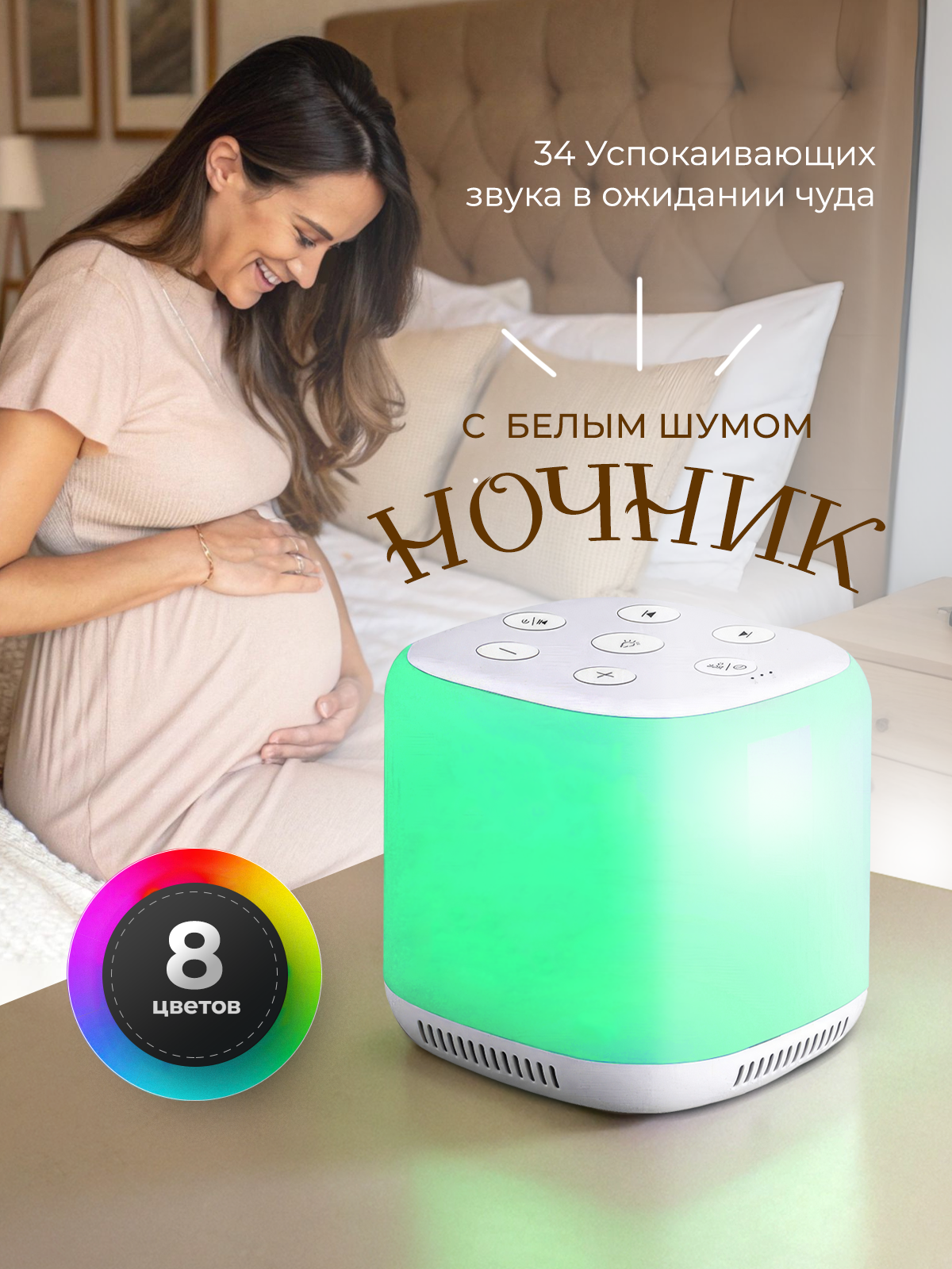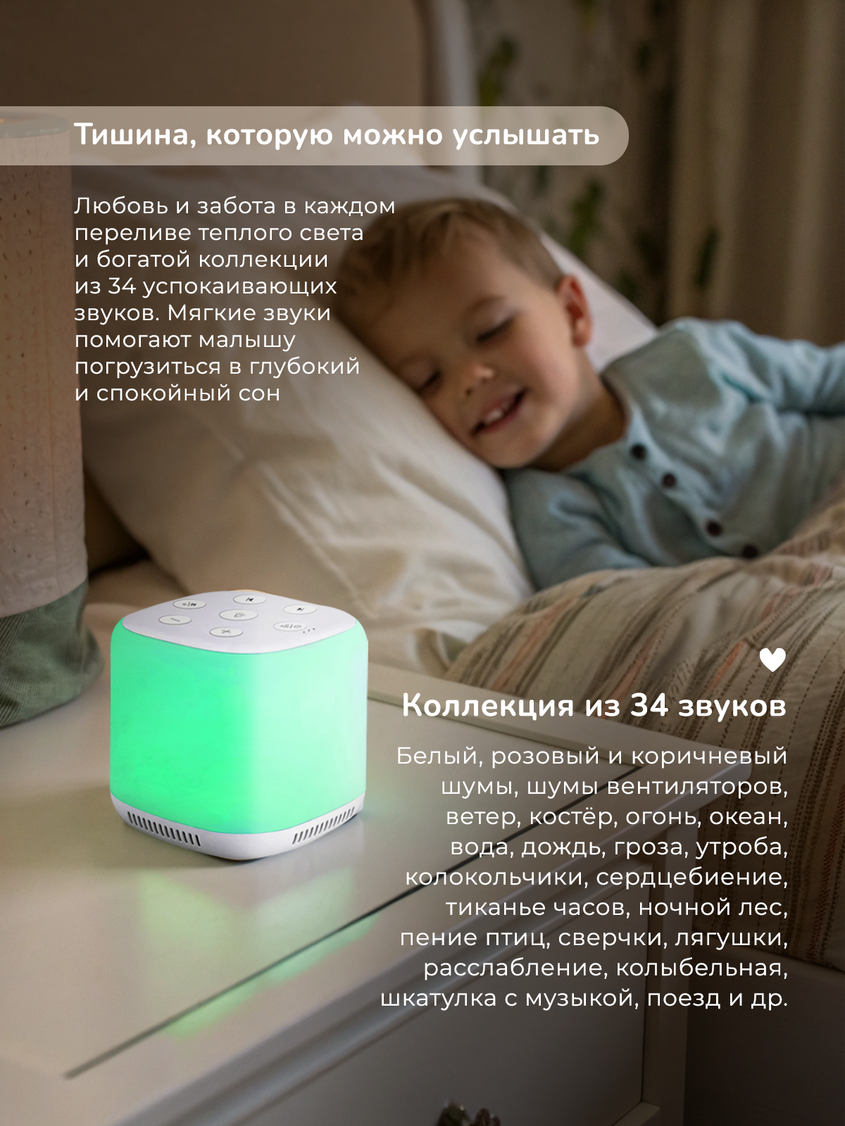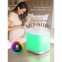 Ночник имеет 8 цветовых решений и коллекцию из 34 звуков, что позволяет выбрать наиболее подходящий вариант для вашего интерьера и настроения.