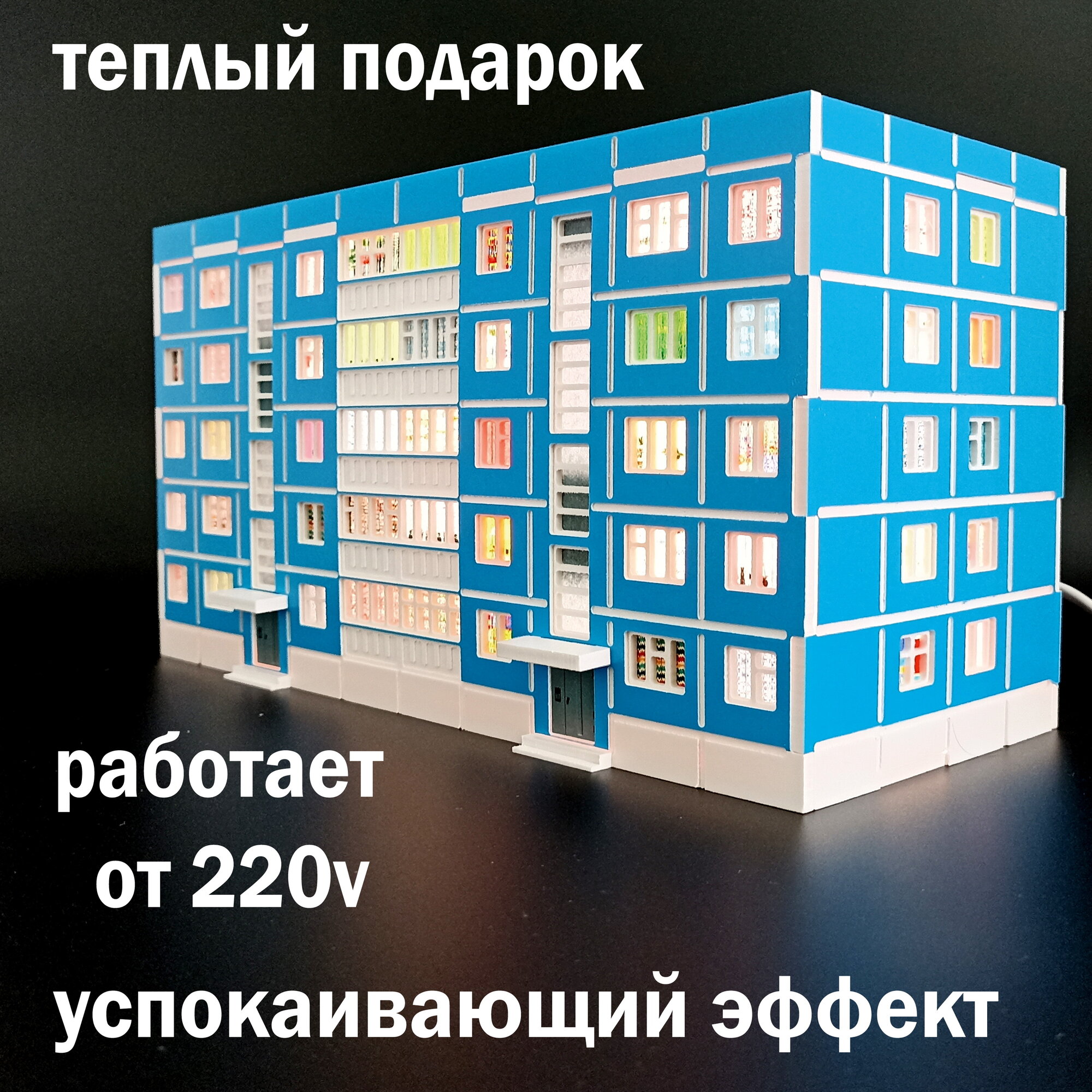 Декоративный ночник в виде панельного дома в 5 этажей Материал - пластик. Размер 29,6*11,9см. Высота 15,6см Питание - розетка 220v Этот светильник можно использовать практически в любом интерьере. От строгого офиса до детской комнаты. Он создаст уютную атмосферу в вашем доме или офисе. Светильник имеет форму пятиэтажного дома Он оснащен одной энергосберегающей лампой с патроном GX53, которая обеспечивает приятный свет без лишнего энергопотребления. Прекрасно вписывается в гостиную, спальню, кабинет, детскую комнату . Материал - пластик толщиной 4мм (не фанера!) Поставляется в разобранном виде, сборка не сложная, клеить ничего не нужно. Инструкция по сборке в комплекте.