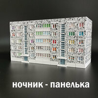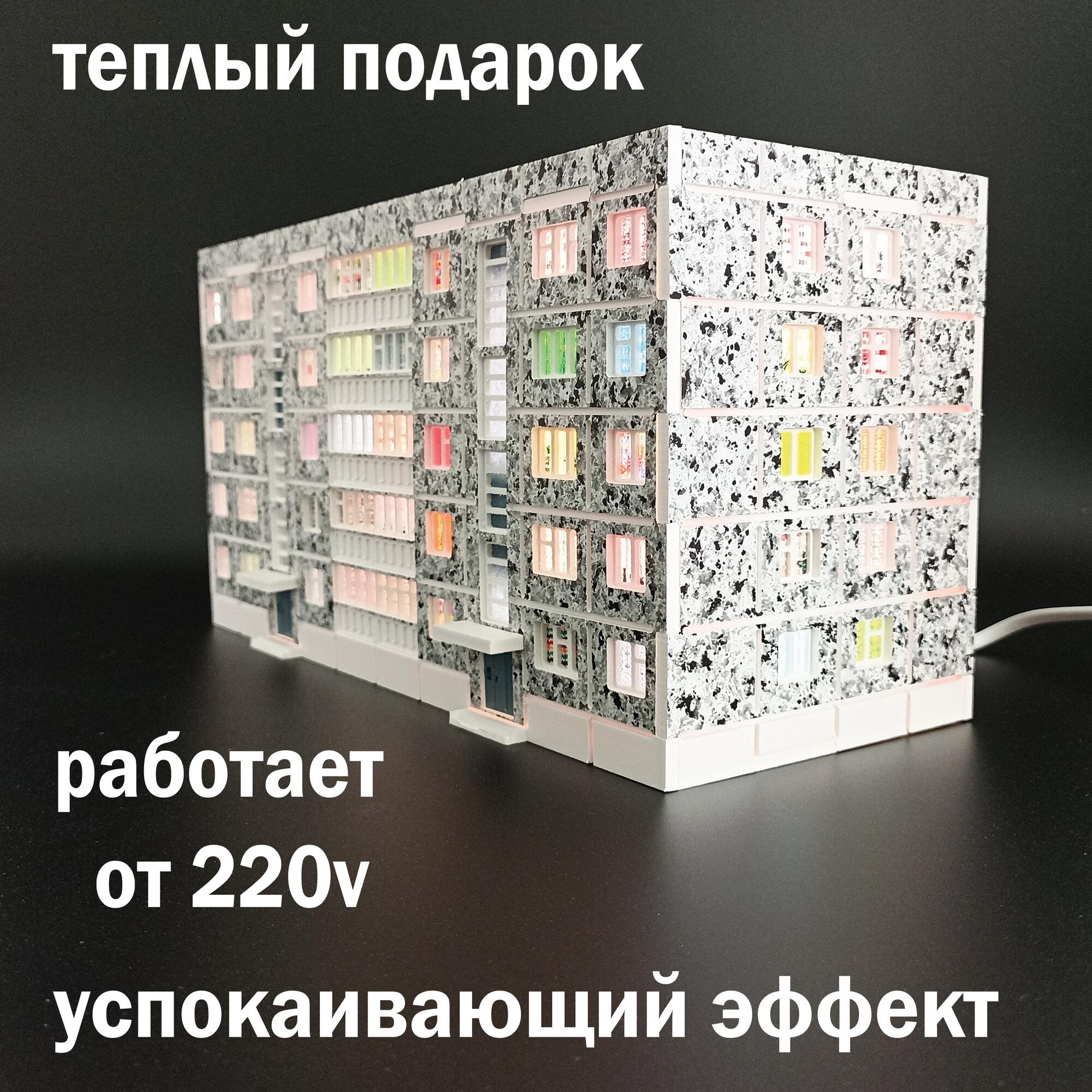 Декоративный ночник в виде панельного дома в 5 этажей Материал - пластик. Размер 29,6*11,9см. Высота 15,6см Питание - розетка 220v Этот светильник можно использовать практически в любом интерьере. От строгого офиса до детской комнаты. Он создаст уютную атмосферу в вашем доме или офисе. Светильник имеет форму пятиэтажного дома Он оснащен одной энергосберегающей лампой с патроном GX53 (современная лампа), которая обеспечивает приятный свет без лишнего энергопотребления. Прекрасно вписывается в гостиную, спальню, кабинет, детскую комнату . Материал - пластик толщиной 4мм (не фанера!) Поставляется в разобранном виде, сборка не сложная, клеить ничего не нужно. Инструкция по сборке в комплекте.