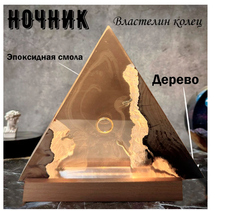 Ночник из эпоксидной смолы Кольцо Всевластия – это оригинальный подарок для поклонников Джона Р. Р. Толкина и вселенной Властелин Колец. Ночник из эпоксидной смолы - исключительно ручная работа, каждый экземпляр уникален поэтому ночник может отличаться от представленных на фотографиях. Спил дерева и заливка эпоксидной смолой в каждом экземпляре будет уникальна . Работает от USB-порта. Он предназначен исключительно для декора и освещения. Ночник прекрасно вписывается в интерьер спальни, офиса или любого другого места, создавая теплую и расслабляющую атмосферу. Благодаря конструкции USB-порта он легко подключается к компьютеру, зарядному устройству мобильного телефона или другим устройствам для зарядки, делая его очень удобным в использовании. В целом, ночник– это интересное и практичное световое устройство.