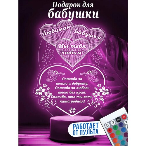 Ночные светильники создают атмосферу сказки и волшебства! Ночник - отличная идея для индивидуального подарка бабушке от дочери или сына, от внука или внучки! Порадуйте своих близких оригинальным подарком. От такого оригинального подарка останутся довольны все, как дети, так и взрослые! Все упаковано в подарочную упаковку с лентой. В ночнике 16 цветов свечения, 4 режима автоматического переключения цветов, а также 4 режима регулировки яркости. Смена цветов осуществляется с помощью пульта дистанционного управления, а также прикосновением к сенсорной кнопке, расположенной на основании ночника. Светильник работает от 3-х батареек АА (не входят в комплектацию) или при помощи USB провода и от адаптера для сети 220В (входят в комплектацию). Рисунок на акрил наносится высококачественной гравировкой, акрил ударопрочный, не нагревается. Абсолютно безопасен для детей. Ночник долговечен, во включенном состоянии светодиоды служат более 30000 часов. Радиус освещения в пределах 2-х метров. Отсутствие нагрева корпуса и картинки. 3д светильник – это не просто осветительный прибор, это также модный предмет интерьера, креативный домашний сувенир и идеальный женский подарок (или дополнение к основному подарку) для любимой бабушки, мамы, тёщи или свекрови на ваш праздник: День рождения (ДР), Юбилей, Новый год (НГ), Рождество, 14 февраля (День святого Валентина / День всех влюблённых), 8 марта (Международный женский день), Пасха, День матери.
