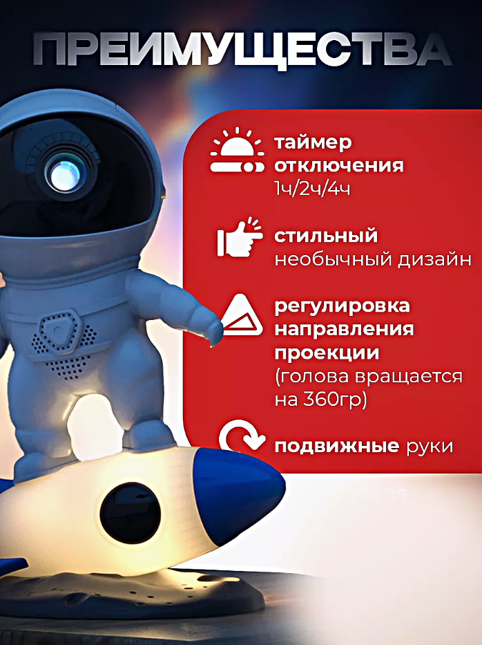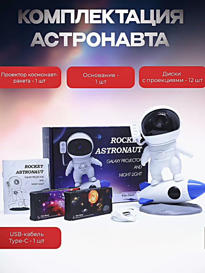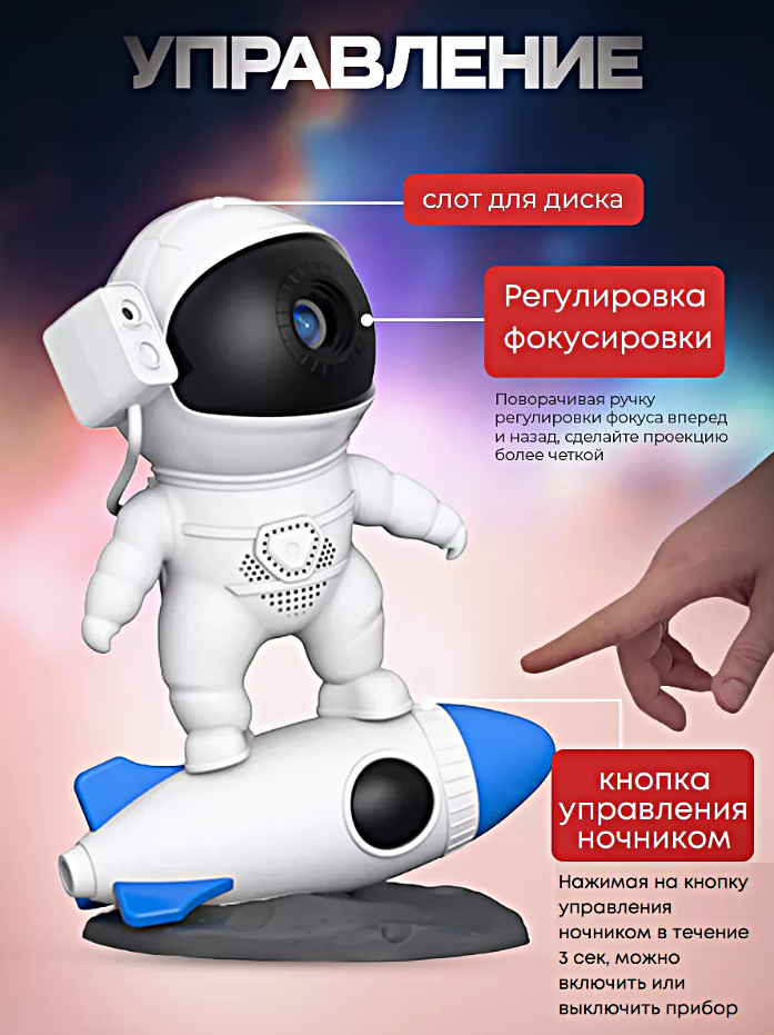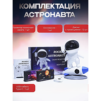 Ночник проектор Астронавт на ракете для детской комнаты, Ночник Космонавт звездное небо, 13 проекций, Белый