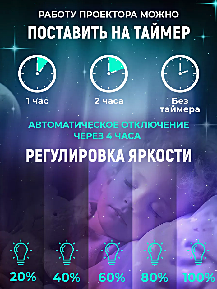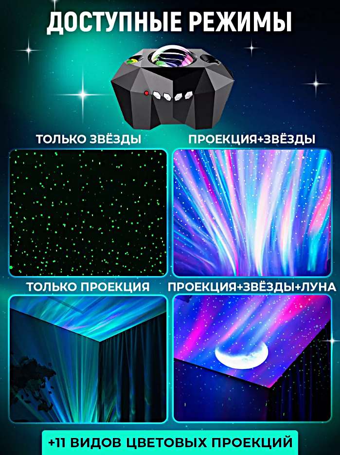 Создать уют и погрузиться в атмосферу галактики и космоса Вам поможет ночник-светильник проектор звездное небо. Наш ночник имеет не только уникальный вид, который дополнит интерьер любой комнаты, но и множество полезных функций. Так же это уникальная интерьерная bluetooth блютуз колонка. 14 вариантов подсветки отлично впишется под любой дизайн проект, 3 режима, а именно звезды, луна и галактика можно использовать как декорации под любой повод, будь то вечеринка, романтический вечер или просто семейный просмотр фильма. Не оставит равнодушным наш 3d 3д ночной светильник и любящих мам, так как у него удобное управление с помощью пульта, режим сна и фоновая музыка (светомузыка), так же будет отлично смотреть как настольный дискошар (диско шар). Внимание! Блок питания и батарейки в комплект не включены! Наша лампа отличная альтернатива нашумевшему светильнику космонавт, так как подойдет не только в детскую комнату, но и во взрослую спальню, гостинную, кухню, ванную и любую комнату и даже на дачу. Проектор обладает мягким светом, элемент вращения позволит окунуться в мир космоса и почувствовать себя героями фильма «Звездных войн». Кнопки управления есть и на самом светильнике. Светодиодный светильник в розетку - это целый планетарий и отличный подарок на любой праздник, например День учителя, Новый год, День рождения. Подойдет для детей, ребенка, взрослых. Так же дочки, сына, малыша, новорожденного. Подарочный набор будет приятным сюрпризом на 8 марта, 23 февраля и 14 февраля любимому и любимой, другу и подруге, маме и папе, брату, парню, девушке