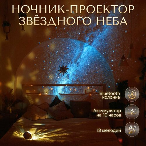 Космический ночник оснащен встроенной Bluetooth колонкой, поэтому управлять им легко и удобно. Проектор предлагает вам 13 различных звуковых сопровождений, но вы всегда сможете включить свою музыку или подкаст, благодаря Bluetooth колонке. Если вы захотите наполнить космосом всю комнату полностью, воспользуйтесь функцией расширенной горизонтальной проекции. Проектор звездного неба заполнит оставшееся место дополнительной проекцией звезд. Горизонтальная проекция имеет 3 разных цвета и 3 режима подсветки.