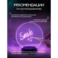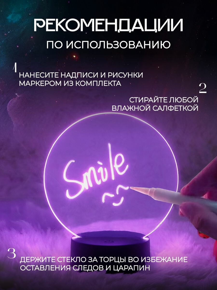Светодиодный ночник работает как от батареек, так и от электрической сети, шнур USB прилагается. Разноцветная LED подсветка переключается сенсорно, касанием руки. Регулировку яркости можно контролировать пультом управления. В комплекте два стеклянных пластины: круглая и в виде сердца, пульт, 7 разноцветных маркера, салфетка и usb кабель.