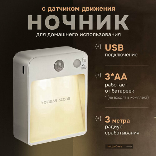 Ночник на батарейках с датчиком движения – идеальное решение для создания уютной атмосферы в вашем доме. Этот светильник очень удобен в использовании и не требует сложного монтажа – просто вставьте в него 3 батарейки которые не идут в комплекте, и он станет вашим надежным помощником в темное время суток.