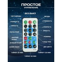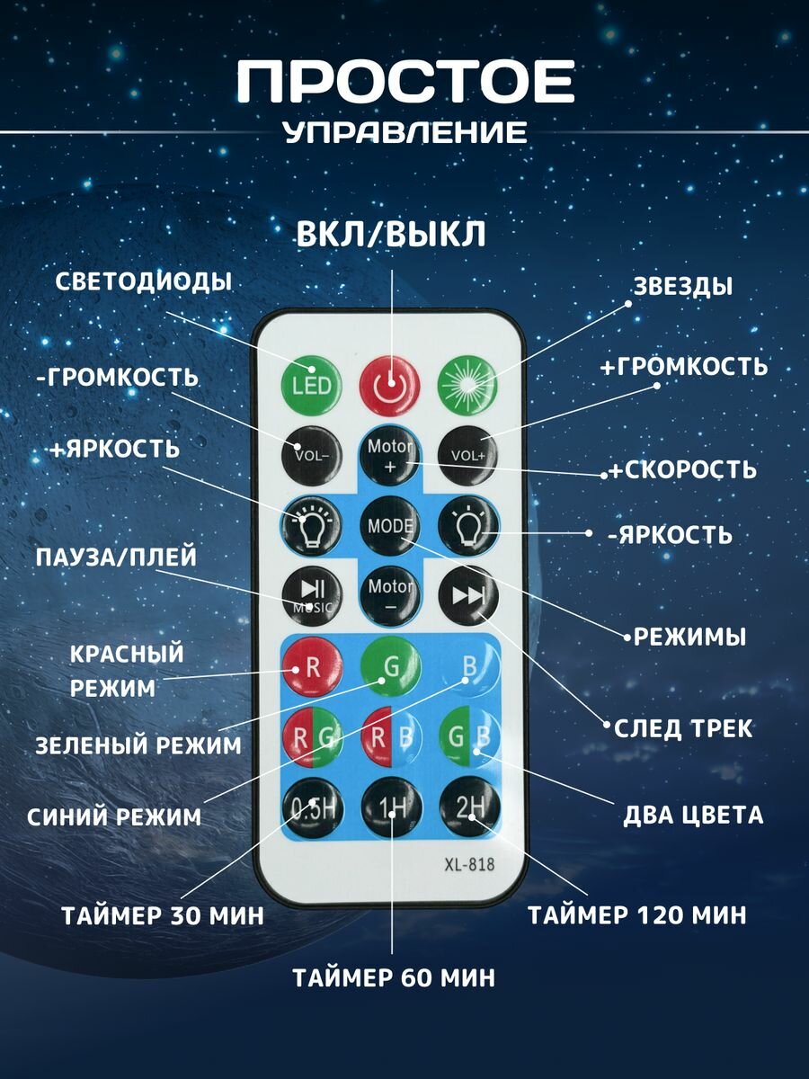 Управление производится с помощью пульта, также имеются кнопки на самом устройстве. С помощью пульта можно легко регулировать цвет и яркость сияния, включать и выключать режим мерцания луны и звезд, так же, можно переключать мелодии и менять громкость. Ночник детский может вращаться на 360 градусов за счет того, что шлем космонавта крепится на сильные магниты. Также ночник детский в розетку имеет слот для карты памяти. Светильник ночник - это настоящий планетарий у Вас дома!