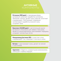 | Активный ингредиент | PHA-кислоты, аденозин, аллантоин, аминокислоты, антиоксиданты, аргинин, бакучиол, бета-глюкан, бетаин, витамин A (ретинол), витамин B3 (ниацинамид), витамин C (аскорбиновая кислота), витамин E, витамины, водоросли, гиалуроновая кислота, глицерин, камфора, керамиды, коллаген, лецитин, морская соль, пальмитоил, пантенол (провитамин B5), пептиды, протеины, спирт, центелла азиатская, церамиды |