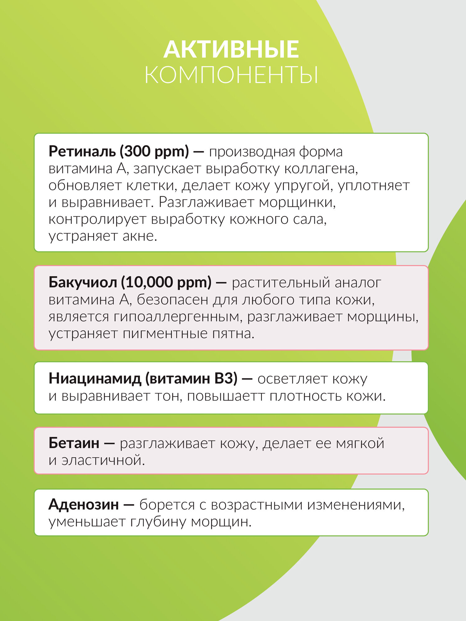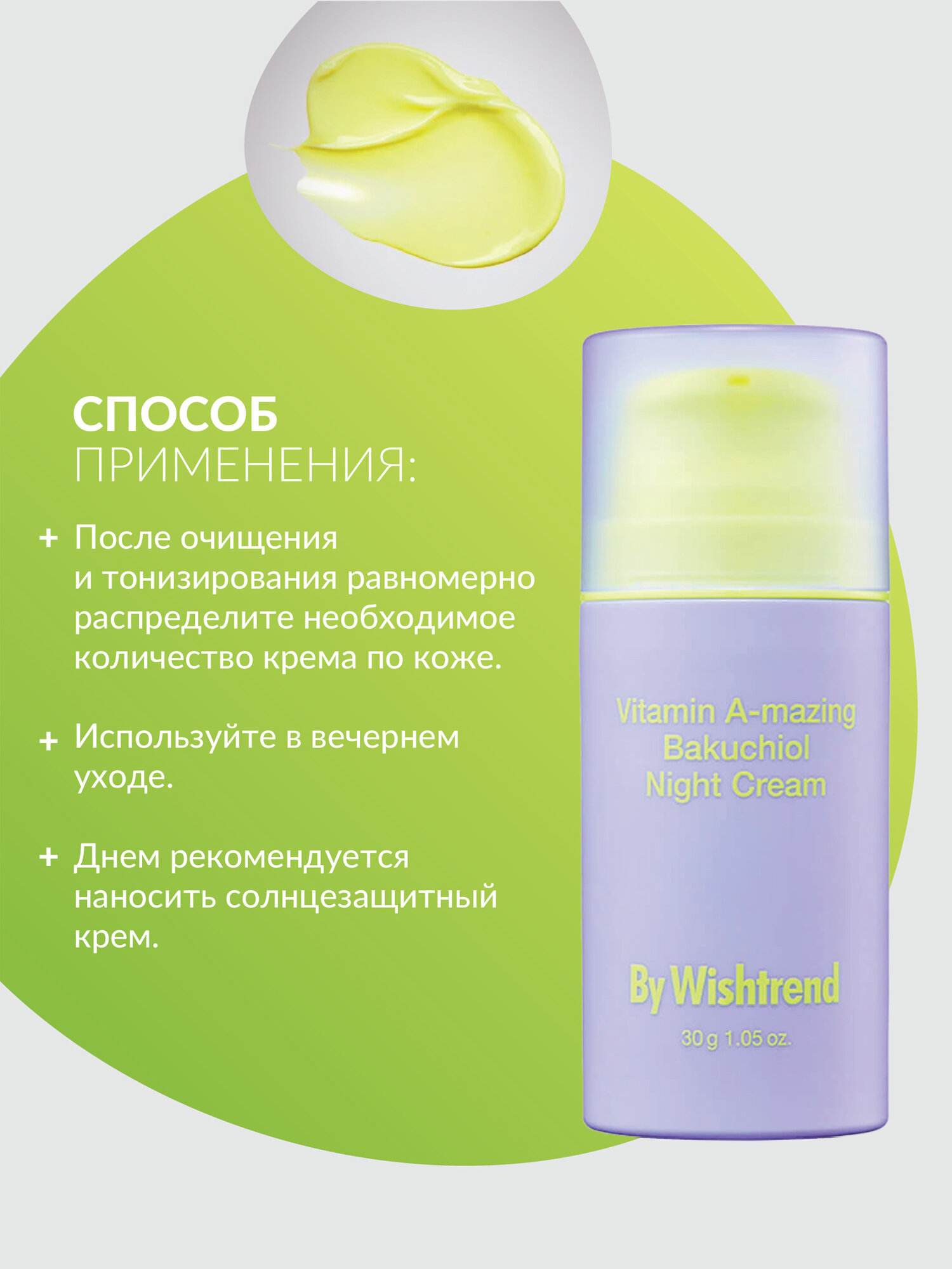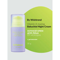 Ночной крем с ретинолом и бакучиолом By Wishtrend Vitamin A-mazing Bakuchiol Night Cream увлажняет, борется с первыми признаками возрастных изменений, стимулирует обновление клеток, разглаживает, улучшает текстуру и состояние кожи. Подходит для чувствительной кожи, не содержит отдушек, красителей и этанола, не нарушает pH-баланс. Рекомендуется использовать в качестве ночного ухода, а при использовании днем — наносить средство с SPF. Характеристики и описание: Цель применения: Уменьшает глубину морщин и предотвращает их появление. Выравнивает микрорельеф. Повышает эластичность. Помогает в борьбе с акне. Увлажняет. Основные ингредиенты и их полезные свойства: 1. Ретинальдегид (300 ppm) или ретиналь — производная форма витамина А. Запускает интенсивный процесс обновления, придает упругость, уплотняет, укрепляет внеклеточный матрикс, нормализует гидролипидный баланс, повышает выработку коллагена, уменьшает выраженность морщин и проявление акне. Действует быстрее и деликатнее других форм витамина A. 2. Бакучиол (10,000 ppm) является растительным аналогом ретинола, стимулирует выработку естественного коллагена в клетках, борется с морщинами, повышает упругость и подавляет выработку меланина, отлично подходит для чувствительной кожи. 3. Ниацинамид (Витамин B3) замедляет доставку меланина к эпидермису, предотвращает образование пигментных пятен. , снижает чувствительность к внешним раздражителям, выравнивает тон, способствует производству коллагена и повышению плотности. 4. Масло макадамского ореха отлично впитывается, увлажняет, смягчает и питает. В состав масла входит более 80% ненасыщенных жирных кислот, похожих на жиры, содержащиеся в нашем эпидермисе. 5. Аденозин — один из самых прогрессивных ингредиентов нового поколения. Эффективно борется с морщинами, оказывая мощное цитопротекторное действие и защищая клетки от окисления, оказывает влияние на синтез проколлагена 1, ответственного за упругость и тонус. 6. Бетаин придает гладкость и мягкость, надолго удерживает влагу, защищает мембраны клеток, устраняет раздражение. Рекомендуется использовать в качестве ночного ухода, а при использовании днем — наносить средство с SPF. Если у вас чувствительная кожа или вы раньше не использовали продукты с ретинолом, вводите крем в уход постепенно (например, используйте средство 2 раза в неделю на протяжении 2 недель, затем, если на коже не появляются признаки раздражения, наносите крем 3 раза в неделю на протяжении 2 недель). Форма выпуска: Яркий флакон с дозатором и колпачком. Вес продукта - 30г. Комплектация: Крем для лица, 30 грамм, 1 штука. Область использования: Лицо. Срок годности в днях: См. на упаковке. Состав: Aqua(Water), Glycerin, Hydrogenated Polydecene, Caprylic/Capric Triglyceride, Betaine, Phenyl Trimethicone, Polyglyceryl-3 Methylglucose Distearate, Cetyl Alcohol, Macadamia Integrifolia Seed Oil, Niacinamide, Glyceryl Glucoside, Glyceryl Stearate, Bakuchiol, Trehalose, Behenyl Alcohol, Pentaerythrityl Distearate, 1,2-Hexanediol, Polyglyceryl-10 Laurate, Ammonium Acryloyldimethyltaurate/VP Copolymer, Dipropylene Glycol, Hydroxyacetophenone, Laminaria Japonica Extract, Eclipta Prostrata Leaf Extract, Sodium Stearoyl Glutamate, Ethylhexylglycerin, Adenosine, Glucose, Fructooligosaccharides, Butylene Glycol, Sodium Hyaluronate, Retinal, Hydrogenated Lecithin, Beta-Glucan, Hydrolyzed Hyaluronic Acid, Centella Asiatica Extract, Ficus Carica (Fig) Fruit Extract, Ceramide NP, Tocopherol, Collagen, Leuconostoc/Radish Root Ferment Filtrate, Palmitoyl Tripeptide-8, Dextran. Способ применения: Нанесите средство на сухое лицо после очищения, тонизации и использования сыворотки. Рекомендуется использовать в качестве ночного ухода, а при использовании днем — нан
