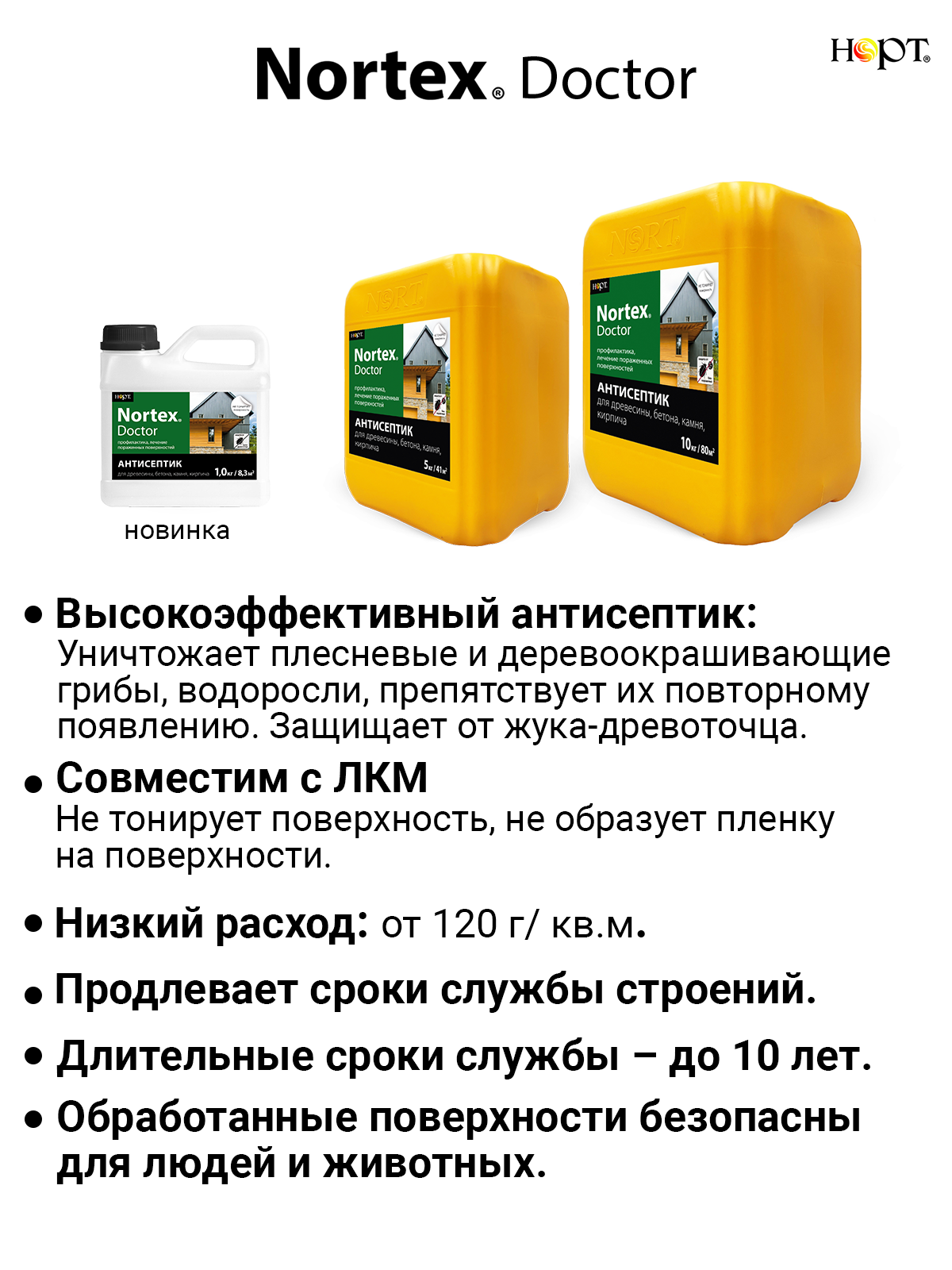 Антисептическая пропитка Нортекс Доктор, невымываемая защита дерева, бетона и кирпича, 10л: сравнение цен, характеристики, фото, актуальное наличие и цены.