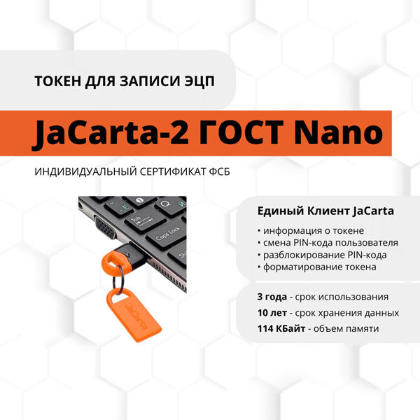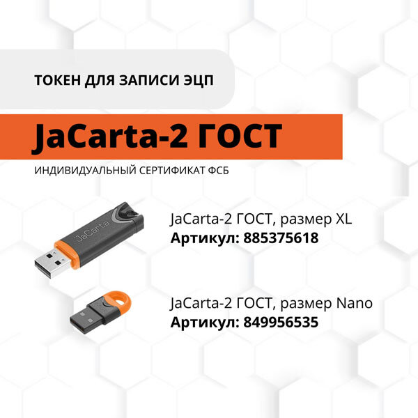 JaCarta-2 ГОСТ - новое поколение продуктов с аппаратной поддержкой ГОСТ Р 34.10-2012 и ГОСТ Р 34.11-2012. Предназначены для использования в качестве сертифицированного средства ЭП (усиленной квалифицированной подписи — укэп) и полноценного СКЗИ в системах электронного документооборота (ЭДО), дистанционного банковского обслуживания (ДБО) и др. для обеспечения юридической значимости и неотказуемости действий пользователей, а также для обеспечения целостности и конфиденциальности передаваемых данных.