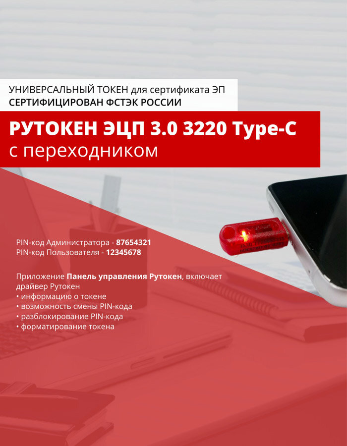 Купить Носитель для электронной подписи (ЭЦП) Рутокен ЭЦП 3.0 3220 Type-C сертифицированный ФСТЭК и переходник с USB Type-C на USB Type — A с доставкой по всей России.