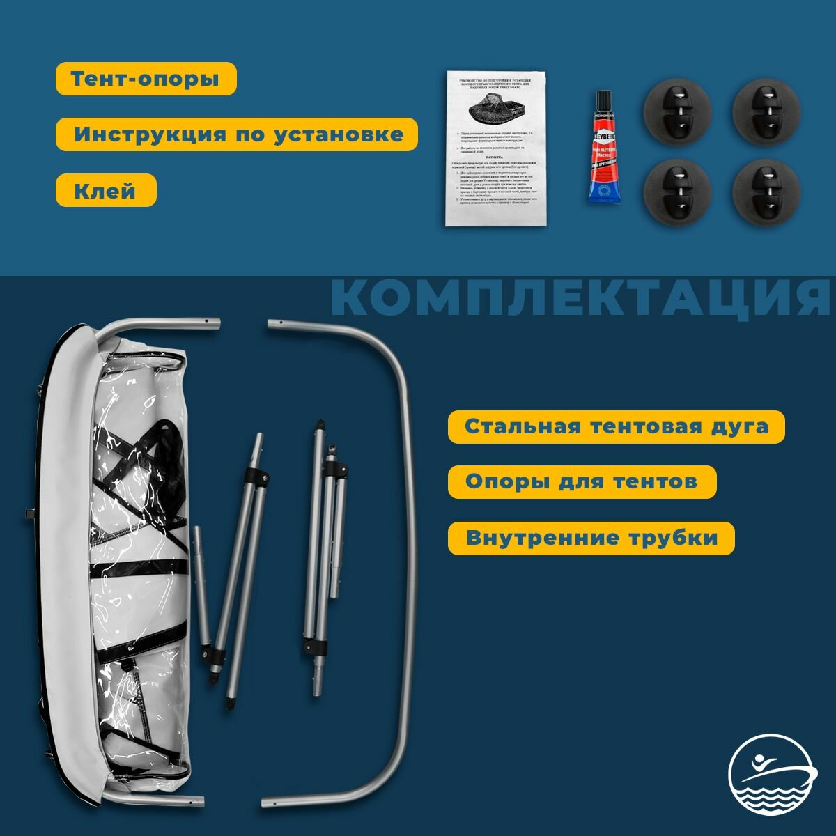 В комплекте с тентом идет тарга. Она изготавливается из алюминиевой анодированной трубы диаметром 22 мм. Дуга жестко фиксируется на баллонах. На нее с легкость можно установить несколько стаканов для спиннингов. Тент разработан с учетом больших нагрузок рассчитанных, в том числе, на использование корабликов для рыбалки.